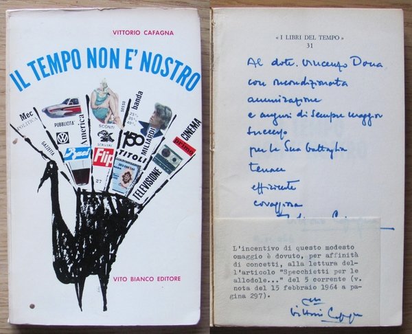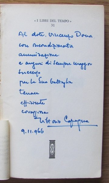 Collana "I Libri del Tempo" N.31. Dedica Autografa dell'autore a Vincenzo Dona all'occhietto. Editore Vito Bianco, I edizione 1965. Brossura editoriale. 12,5x20; pp.318. Raro, Ottimo stato. , Ottimo (Fine)