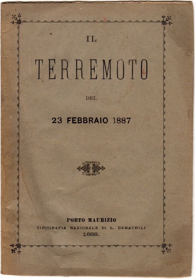 Opuscolo in 16° (cm. 16 x 11), pp. 16. Brossura editoriale a stampa. Poema composto a scopo morale sul devastante terremoto che colpì la riviera ligure di ponente il 23 febbraio 1887. L'autore, Agostino Sciaguato, era canonico della collegiata di Diano Castello.