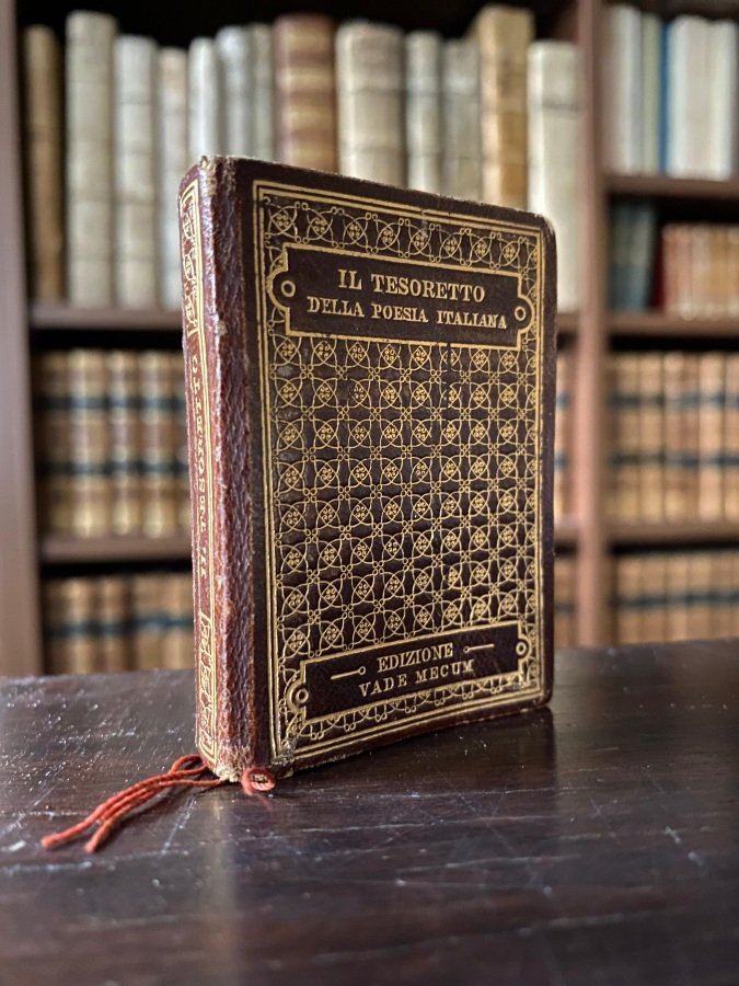 In-32° (cm. 6,4), graziosa legatura editoriale in piena pelle con ricche decorazioni in oro entro cornici di doppi filetti sempre in oro, titolo al dorso e al piatto anteriore, tagli in rosso; pp. VIII 422 in ottimo stato. Edizione non comune della collana «Vade Mecum», in queste piccole dimensioni. Ottimo esemplare.