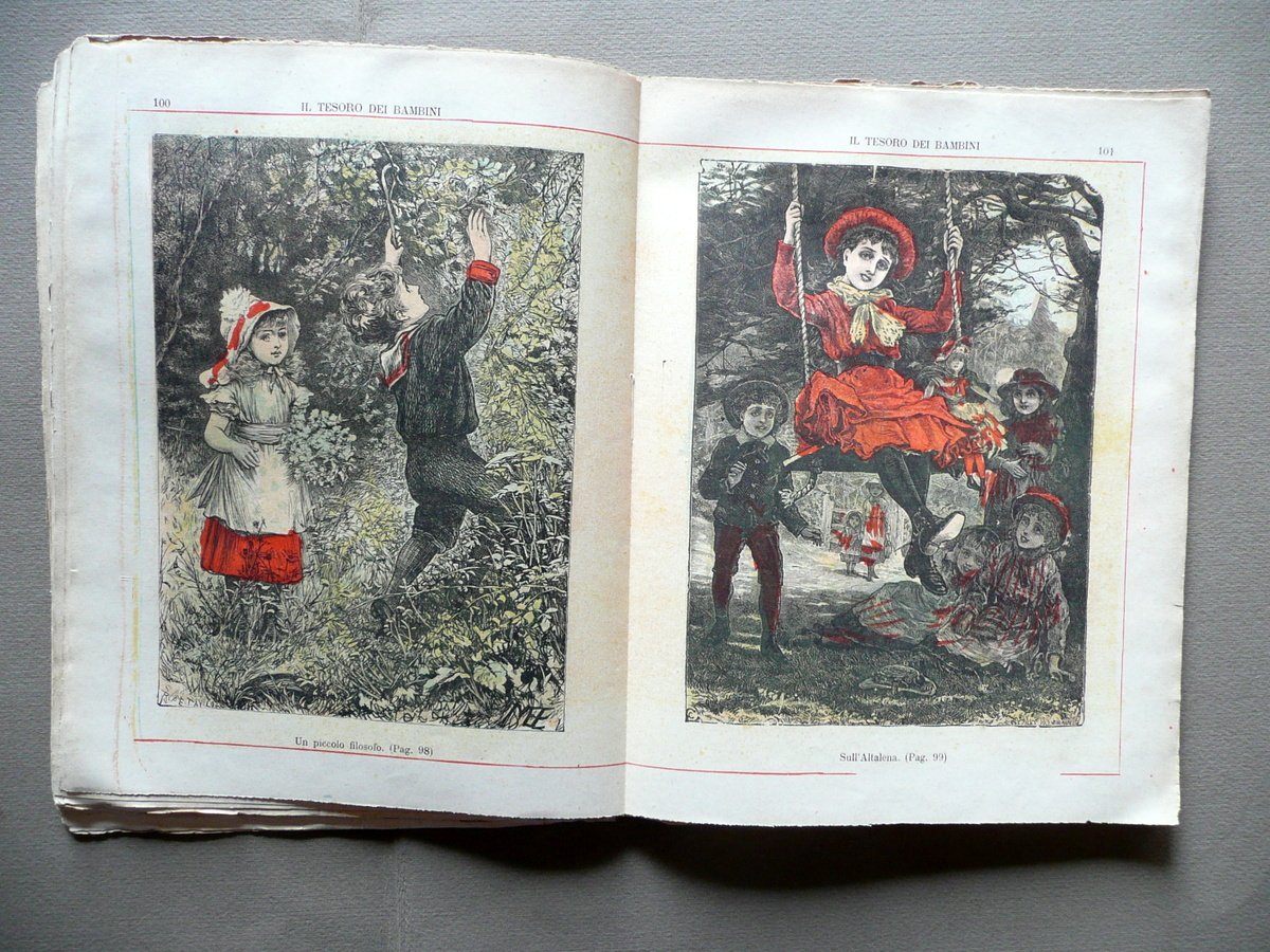 Nove numeri di rivista, Emma Perodi, Il Tesoro dei Bambini" Giornale settimanale illustrato a colori Diretto dalla Signora Emma Perodi Parte XII - Nove numeri completi della suddetta rivista (dal numero 5 al numero 14) inseriti entro brossura editoriale originale illustrata a colori Edoardo Perino, Roma 1895; cm 25,5x19,5; pp. 112 totali (esemplari autonomi con numerazione progressiva), con varie bellissime illustrazioni litografiche fuori testo, ritoccate a colori (vedi foto); nove numeri completi della suddetta rivista (dal numero 5 del 3/2/1895 al numero 14 del 7/4/1895) che ne costituiscono la parte XII, inseriti entro brossura ed. originale ill. a colori. Brossura ant. con vecchia etichetta applicata. Condizioni di conservazione Esemplare in condizioni più che discrete con tracce d'uso e del tempo, qualche piccola lieve brunitura e alone, margini delle brossure con alcuni piccoli strappetti, angolo inf. della brossura post. con una piccola mancanza; dorso in larga parte mancante con conseguente allentamento delle cuciture (vedi foto). Margini dell'esemplare con qualche lievissima poco visibile traccia di vecchia umidità, le quali non interessano il testo o le illustrazioni (vedi foto). Nove numeri completi della suddetta rivista (dal numero 5 del 3/2/1895 al numero 14 del 7/4/1895) che ne costituiscono la parte XII. Bellissime le illustrazioni litografiche fuori testo, ritoccate a mano (vedi foto). SC03.D13032 N "