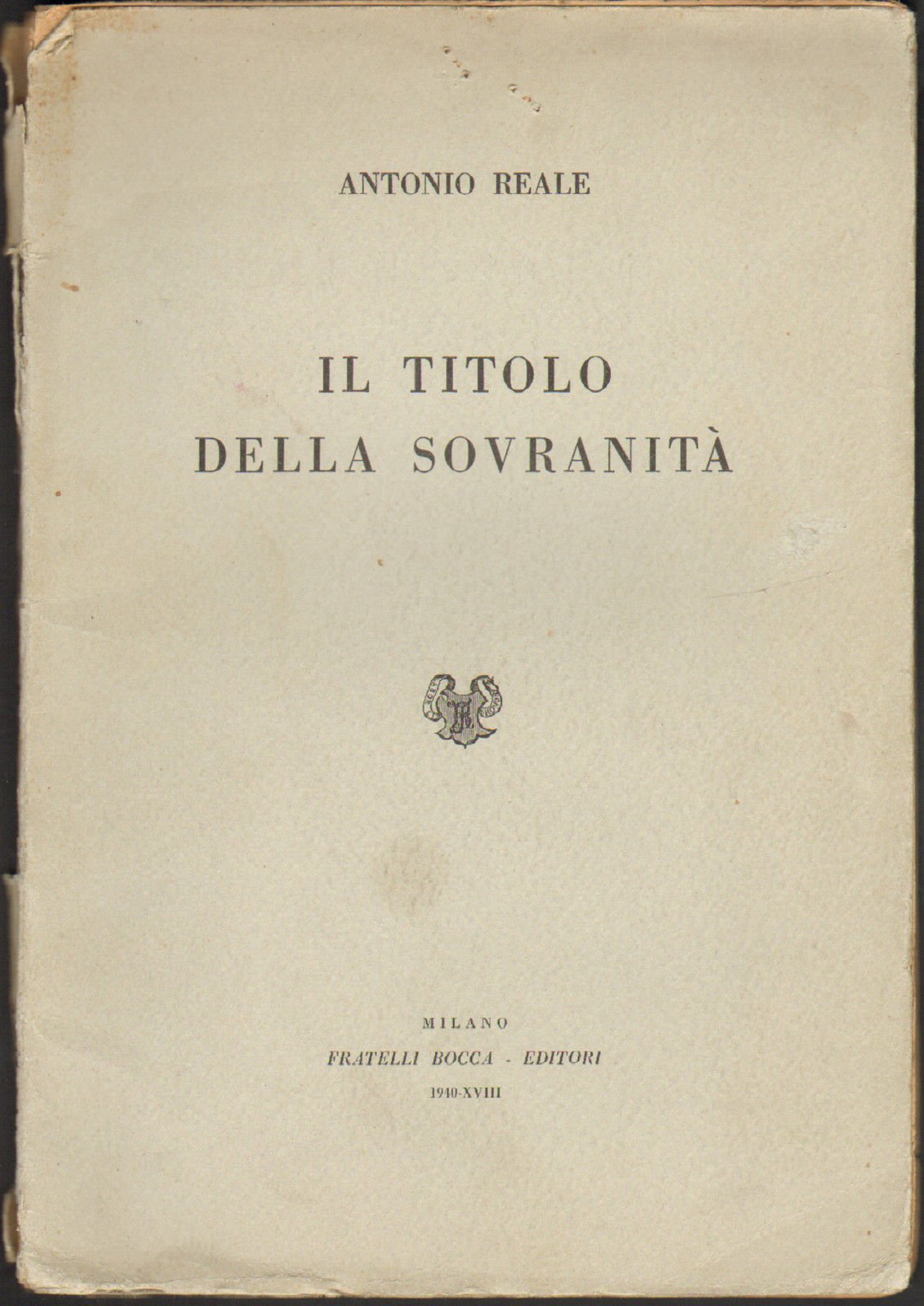 IL TITOLO DELLA†SOVRANITA' ANTONIO REALE FRATELLI BOCCA EDITORI MILANO 1940 PP. 47 CM. 26 X 18. UN ANALISI NON TROPPO DI PARTE SUL FASCISMO SULLA MONARCHIA, E SUI POTERI POLITICI IN GENERALE. L 4425 NESSUN RIFERIMENTO TROVATO DI QUESTA OPERA NELLE BIBLIOGRAFIE CONSULTATE. LEGATURA STACCATA DAL LIBRO, CON MANCANZE AL DORSO E ARRICCIATURE AGLI ANGOLI, ALCUNI FORI AL MARGINE SUPERIORE ANCHE ALLA PRIMA PAGINA BIANCA. PAGINE INTERNE LEGGERMENTE BRUNITE, CON ARRICCIATURA AGLI ANGOLI, LEGATURA ALLENTATA