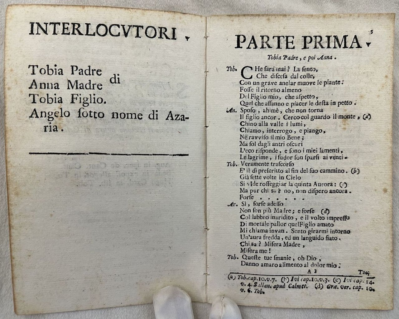 Raro libretto della prima rappresentazione del componimento "Il Tobia" di Aberilmo Eginense pseudonimo di Giovanni Antonio Battista Visconti (Vernazza 1722-1784) membro delle Accademie degli Aborigeni, Infecondi, Forti, Umbri di Foligno. Musica di Francisco Javier Garcia Fajer (1731-1809). In buone condizioni. Copertina assente. Legatura in buone condizioni. Pagine in buone condizioni con fioriture. In 16. 17,5x11,5 cm. Pp. 24.Scarce booklet of the first representeation of the component "Il Tobia" by Aberilmo Eginense pseudonymous of Giovanni Antonio Battista Visconti (Vernazza 1722-1784) member of Accademie degli Aborigeni, Infecondi, Forti, Umbri di Foligno. Music by Francisco Javier Garcia Fajer (1731-1809). In good conditions. Cover lacks. Binding in good conditions. Inside pages are in good conditions with foxing. In 16. 17,5x11,5 cm. Pp. 24.