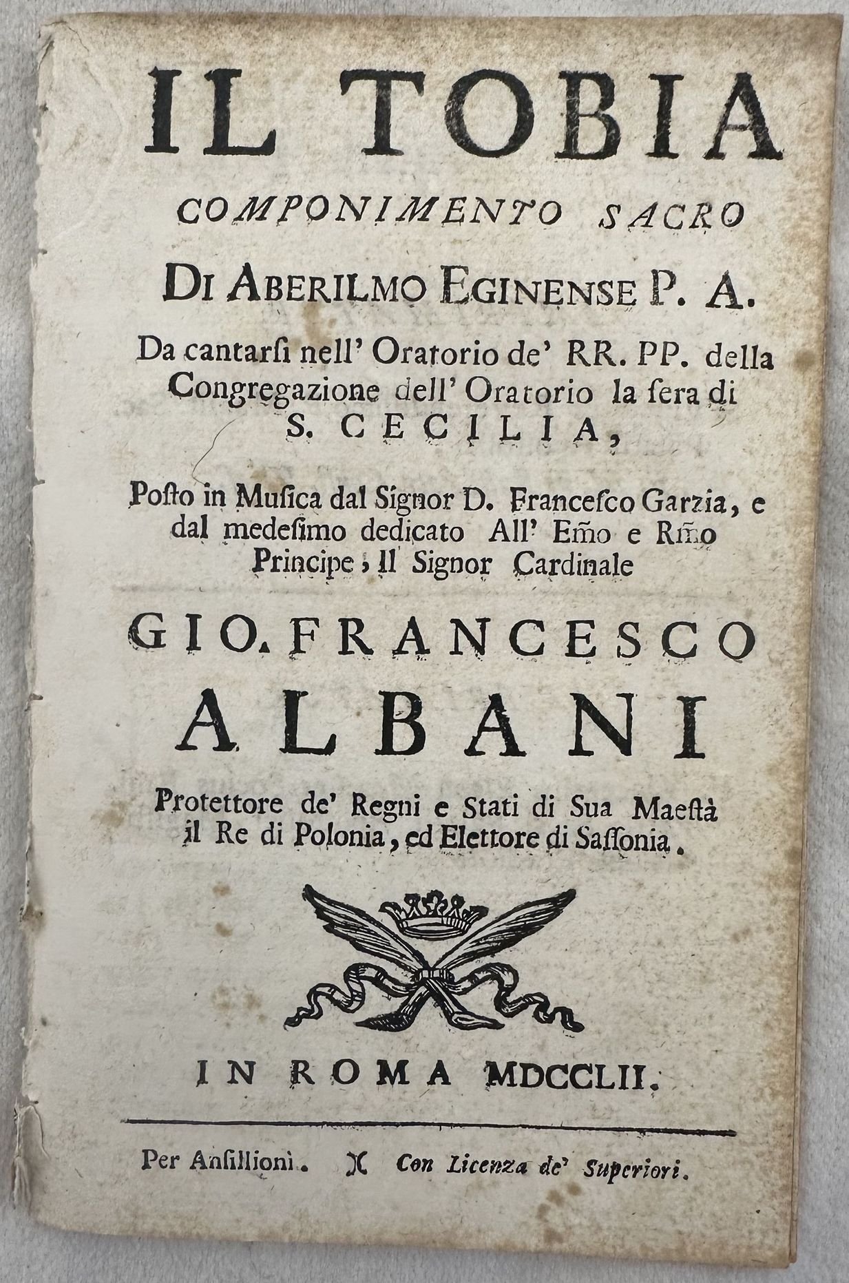 IL TOBIA COMPONIMENTO SACRO DI ABERILMO EGINENSE P. A. DA CANTARSI NELL'ORATORIO DE RR. PP., DELLA CONGREGAZIONE DELL'ORATORIO, LA SERA DI S. CECILIA POSTO IN MUSICA DAL SIGNOR D. FRANCESCO GARZIA E DAL MEDESIMO DEDICATO ALL'EMO E RMO PRINCIPE, IL S