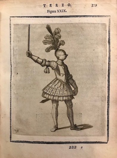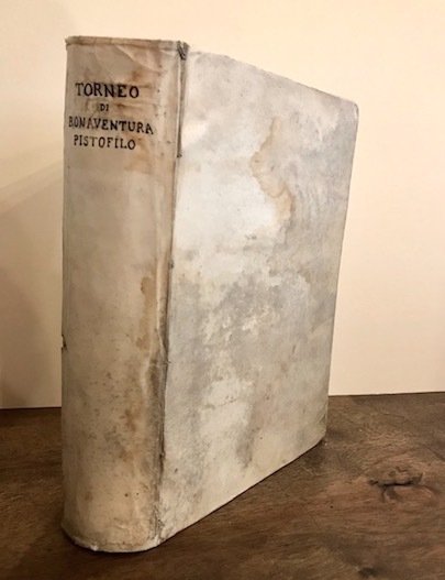 4to (cm. 23,2), 9 cc.nn. (compreso frontespizio allegorico e ritratto dell’Autore, assente la carta d’occhietto), 555(1) pp. e 117 ill.ni calcografiche a piena pagina di Giovanni Battista Coriolano. Legatura antica in piena pergamena rigida con titolo ms. al ds. Alone di sofferta umidità al piatto anteriore, minimo restauro alla cuffia inferiore e rinforzi interni alle cerniere. Carta di guardia libera anteriore rinnovata. Ex libris al contropiatto. Alcuni tenui aloni, peraltro esemplare in ottimo stato di conservazione con le incisioni in vivida impressione. La Dedicatoria è datata 4 Gennaio 1627 (facendo presumere dunque che il frontespizio, il colophon e probabilmente l’intero volume fossero già stati stampati nel precedente anno). Prima ed unica edizione di un’opera estremamente rara e ricercata dedicata al costume cavalleresco. Cockle, 918; Vinciana, 308.