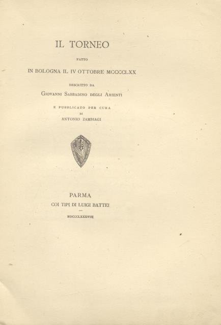 IL TORNEO FATTO IN BOLOGNA IL IV OTTOBRE 1470. Descritto da Giovanni Sabbadino Degli Arienti e pubblicato per cura di Antonio Zambiagi.