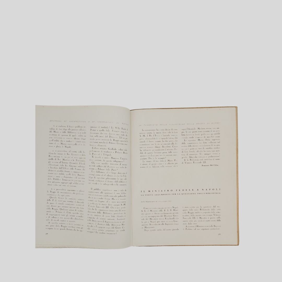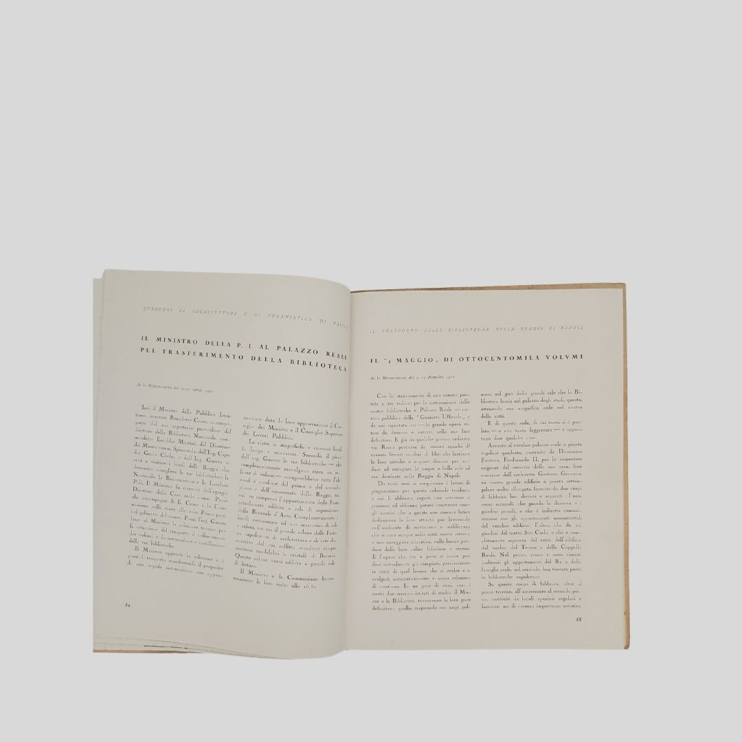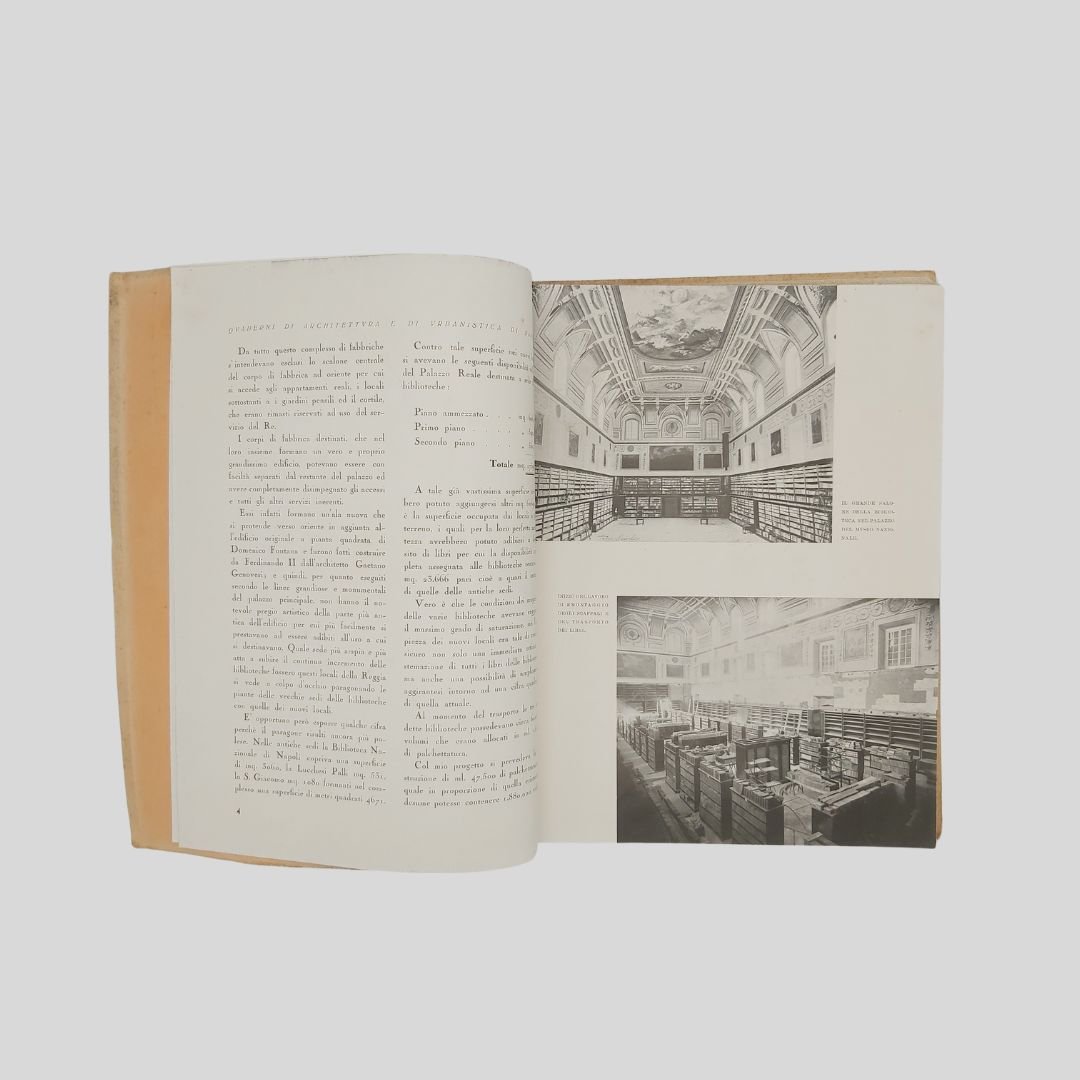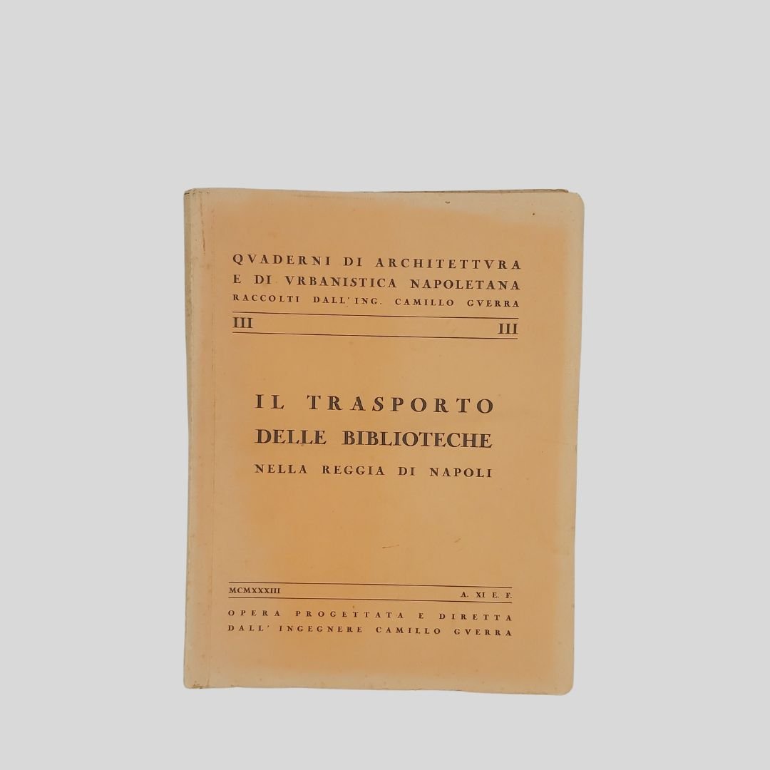 In-4° (cm 29,8), pp. 104 (4). Con numerose ripr. fotogr. n.t., interc. e a p. pagina. [Quaderni di Architettura e di urbanistica napoletana raccolti dall’Ing. Camillo Guerra]. Tracce d’uso alle cop., un po’ stinte, interno in buono stato. Solo tre esemplari in SBN. Non comune. Il volume raccoglie, oltre a un importante corredo iconografico, interventi e articoli apparsi , tra gli altri, sul quotidiano “Il Mezzogiorno”. Il 17 maggio 1927 alla presenza del re Vittorio Emanuele III – a cui la biblioteca è intitolata – si inaugurò la nuova sede di Palazzo Reale.<BR><BR>L’originaria sede del Palazzo degli Studi (attuale MANN) era divenuta inadeguata alle dimensioni ed alle necessità di una Biblioteca che tanto si era accresciuta nel tempo, intanto fu accorpata ad essa la Biblioteca teatrale Lucchesi Palli. Iniziò così il dibattito sulla scelta dell’edificio da destinare a tale uso; dibattito protrattosi fino al 1922 quando, grazie soprattutto all’interessamento di Benedetto Croce, ne fu deliberato il trasferimento a Palazzo Reale in piazza del Plebiscito. In quegli anni furono annesse alla Nazionale la Biblioteca del Museo di San Martino, la Brancacciana, la Provinciale, la San Giacomo.<BR><BR>La Biblioteca Nazionale di Napoli oggi è in fase di trasferimento da Palazzo Reale a Palazzo Fuga (Real Albergo dei Poveri). Lo spostamente della sede è stato oggetto di discussione e stanziamento di fondi, con l’obiettivo di liberare spazio a Palazzo Reale per altre esigenze, come la sistemazione di uffici ministeriali. Il progetto prevede la sistemazione della biblioteca in un’area di circa centomila metri quadrati a piazza Carlo III.<BR><BR>.
