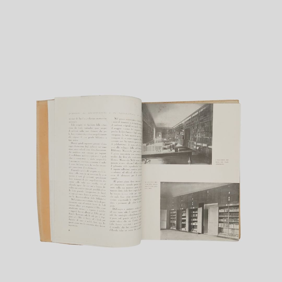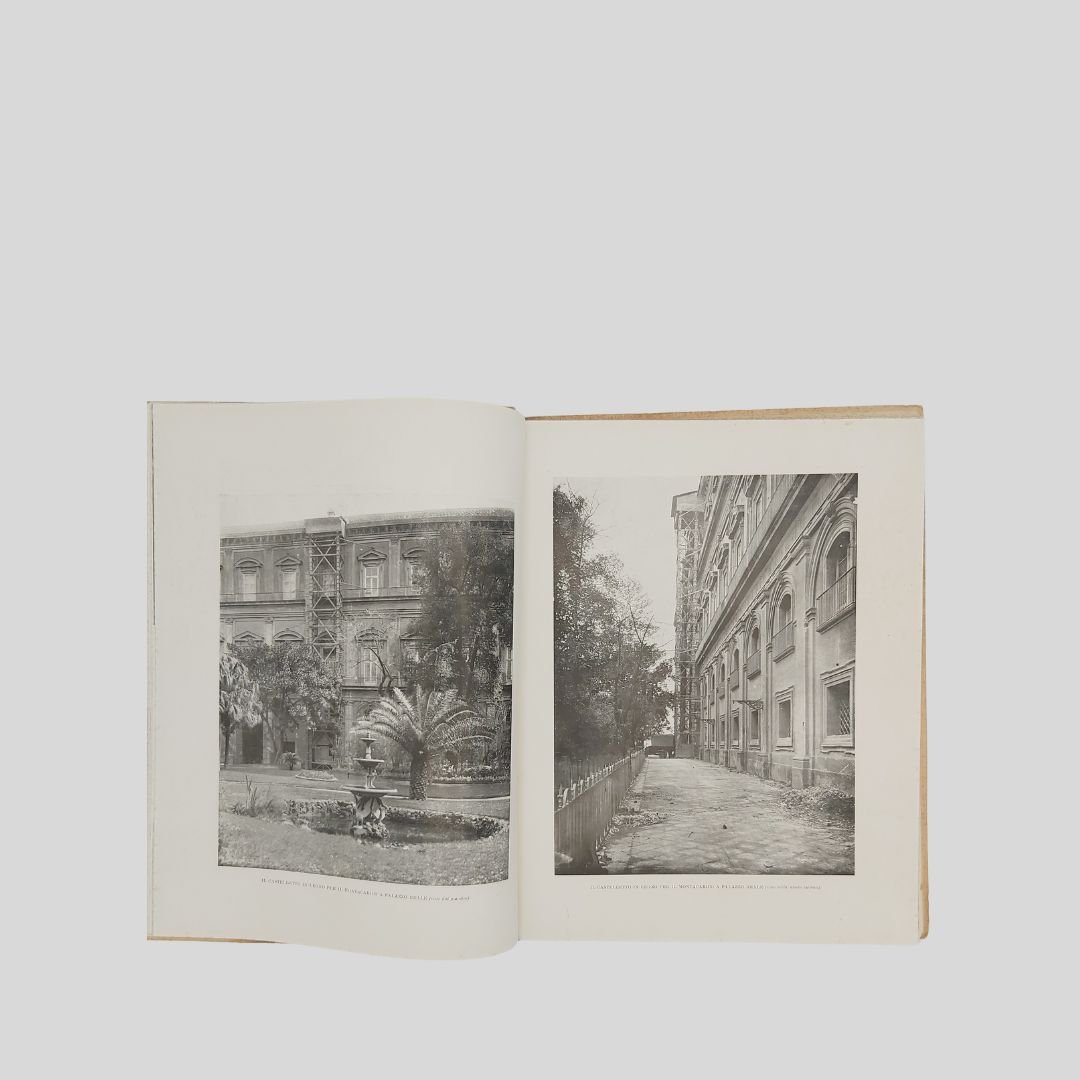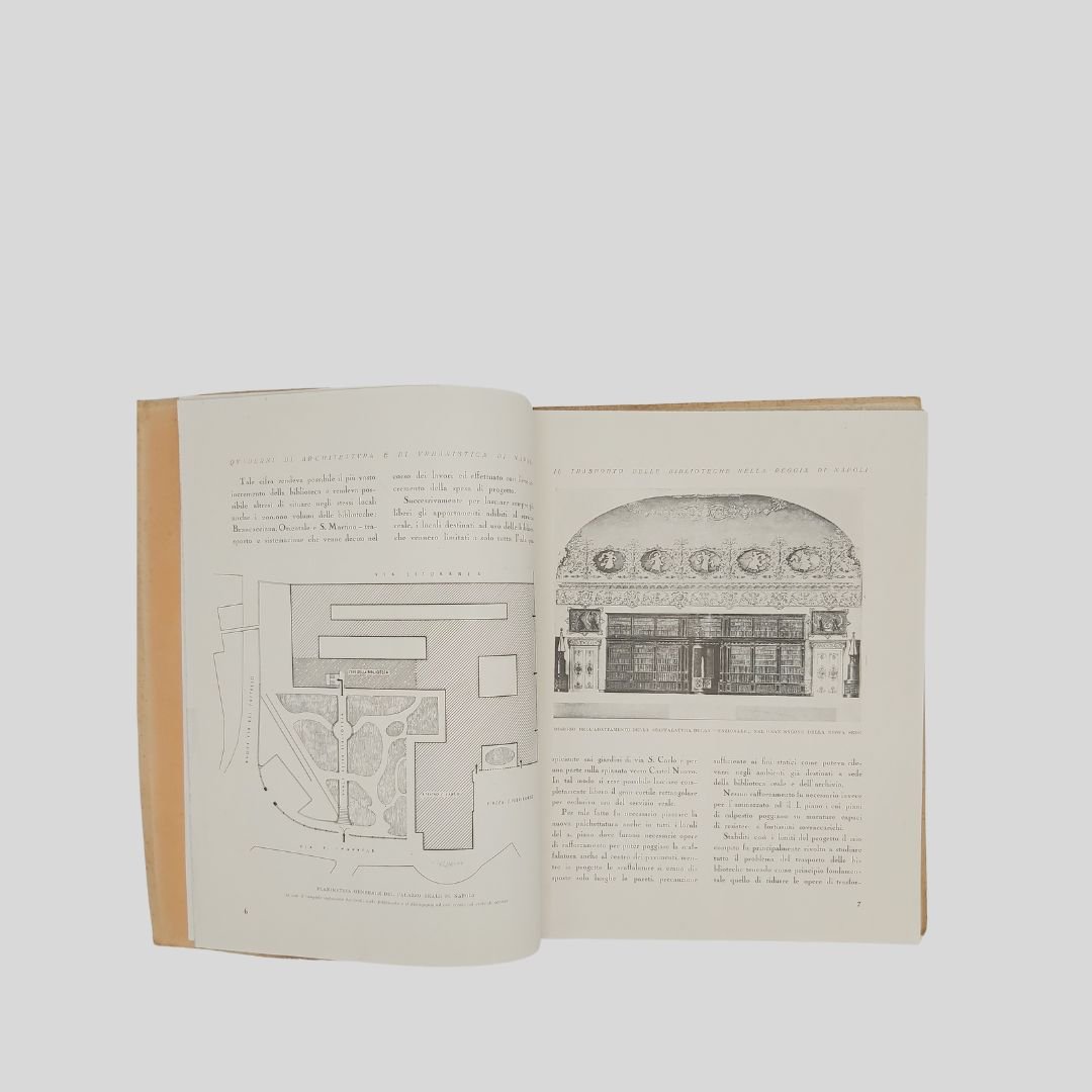In-4° (cm 29,8), pp. 104 (4). Con numerose ripr. fotogr. n.t., interc. e a p. pagina. [Quaderni di Architettura e di urbanistica napoletana raccolti dall’Ing. Camillo Guerra]. Tracce d’uso alle cop., un po’ stinte, interno in buono stato. Solo tre esemplari in SBN. Non comune. Il volume raccoglie, oltre a un importante corredo iconografico, interventi e articoli apparsi , tra gli altri, sul quotidiano “Il Mezzogiorno”. Il 17 maggio 1927 alla presenza del re Vittorio Emanuele III – a cui la biblioteca è intitolata – si inaugurò la nuova sede di Palazzo Reale.<BR><BR>L’originaria sede del Palazzo degli Studi (attuale MANN) era divenuta inadeguata alle dimensioni ed alle necessità di una Biblioteca che tanto si era accresciuta nel tempo, intanto fu accorpata ad essa la Biblioteca teatrale Lucchesi Palli. Iniziò così il dibattito sulla scelta dell’edificio da destinare a tale uso; dibattito protrattosi fino al 1922 quando, grazie soprattutto all’interessamento di Benedetto Croce, ne fu deliberato il trasferimento a Palazzo Reale in piazza del Plebiscito. In quegli anni furono annesse alla Nazionale la Biblioteca del Museo di San Martino, la Brancacciana, la Provinciale, la San Giacomo.<BR><BR>La Biblioteca Nazionale di Napoli oggi è in fase di trasferimento da Palazzo Reale a Palazzo Fuga (Real Albergo dei Poveri). Lo spostamente della sede è stato oggetto di discussione e stanziamento di fondi, con l’obiettivo di liberare spazio a Palazzo Reale per altre esigenze, come la sistemazione di uffici ministeriali. Il progetto prevede la sistemazione della biblioteca in un’area di circa centomila metri quadrati a piazza Carlo III.<BR><BR>.