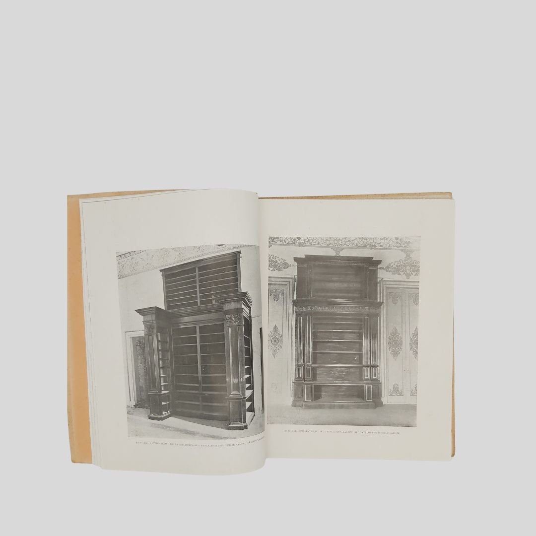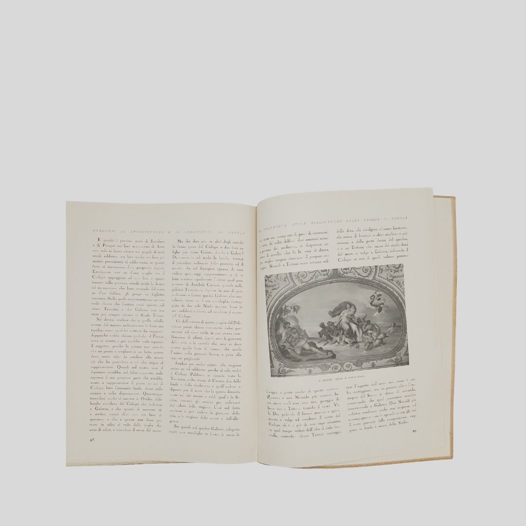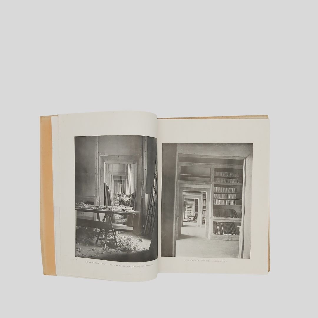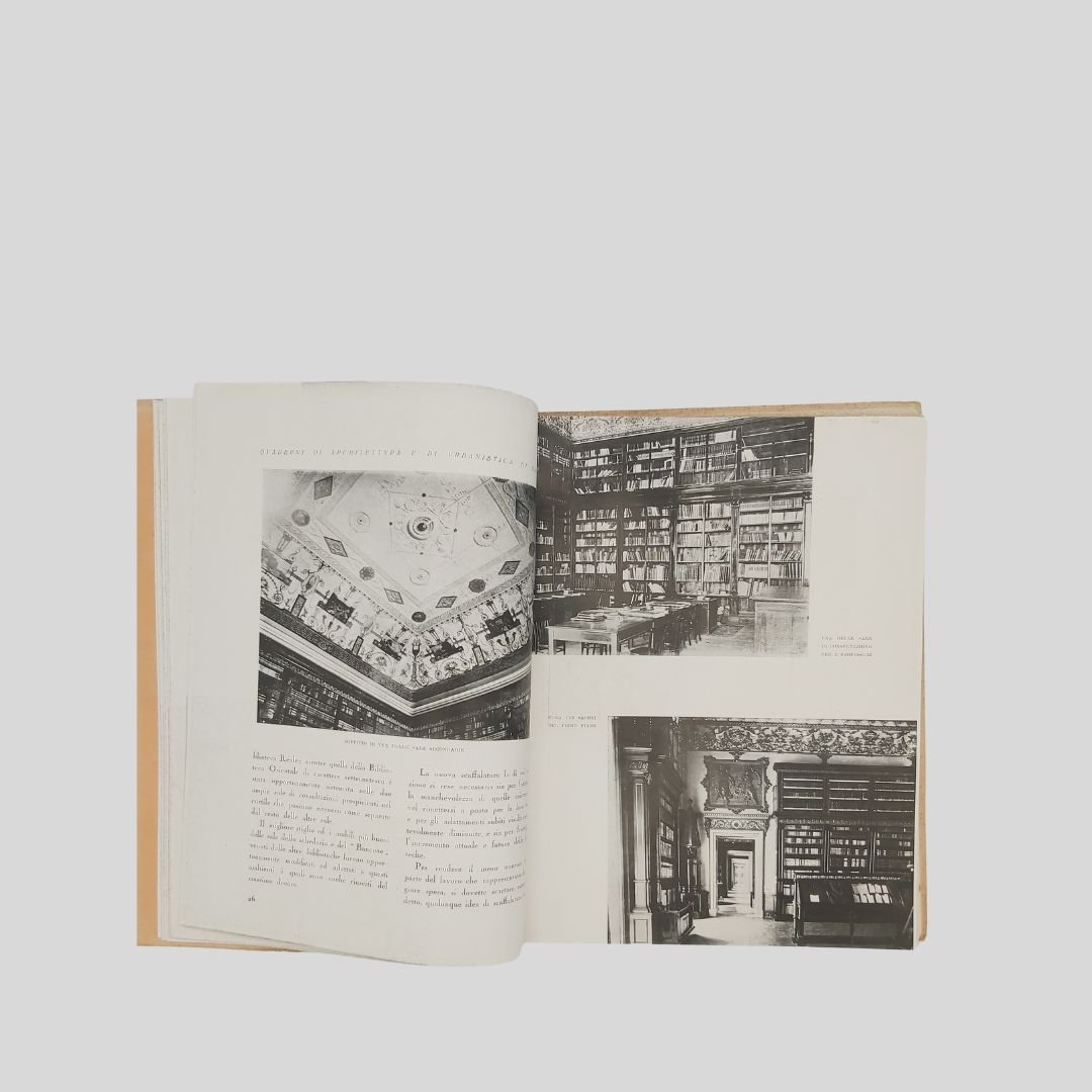 In-4° (cm 29,8), pp. 104 (4). Con numerose ripr. fotogr. n.t., interc. e a p. pagina. [Quaderni di Architettura e di urbanistica napoletana raccolti dall’Ing. Camillo Guerra]. Tracce d’uso alle cop., un po’ stinte, interno in buono stato. Solo tre esemplari in SBN. Non comune. Il volume raccoglie, oltre a un importante corredo iconografico, interventi e articoli apparsi , tra gli altri, sul quotidiano “Il Mezzogiorno”. Il 17 maggio 1927 alla presenza del re Vittorio Emanuele III – a cui la biblioteca è intitolata – si inaugurò la nuova sede di Palazzo Reale.<BR><BR>L’originaria sede del Palazzo degli Studi (attuale MANN) era divenuta inadeguata alle dimensioni ed alle necessità di una Biblioteca che tanto si era accresciuta nel tempo, intanto fu accorpata ad essa la Biblioteca teatrale Lucchesi Palli. Iniziò così il dibattito sulla scelta dell’edificio da destinare a tale uso; dibattito protrattosi fino al 1922 quando, grazie soprattutto all’interessamento di Benedetto Croce, ne fu deliberato il trasferimento a Palazzo Reale in piazza del Plebiscito. In quegli anni furono annesse alla Nazionale la Biblioteca del Museo di San Martino, la Brancacciana, la Provinciale, la San Giacomo.<BR><BR>La Biblioteca Nazionale di Napoli oggi è in fase di trasferimento da Palazzo Reale a Palazzo Fuga (Real Albergo dei Poveri). Lo spostamente della sede è stato oggetto di discussione e stanziamento di fondi, con l’obiettivo di liberare spazio a Palazzo Reale per altre esigenze, come la sistemazione di uffici ministeriali. Il progetto prevede la sistemazione della biblioteca in un’area di circa centomila metri quadrati a piazza Carlo III.<BR><BR>.