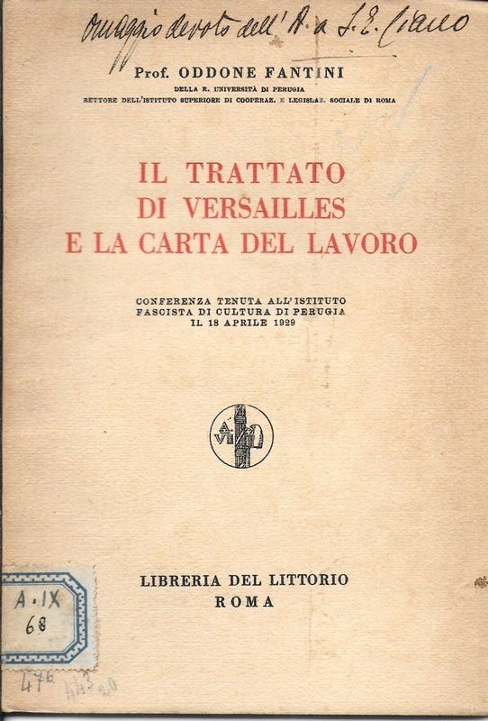 Il trattamento di Versailles e la carta del lavoro. Conferenza tenuta all'Istituto Fascista di Cultura di Perugia - 1929.