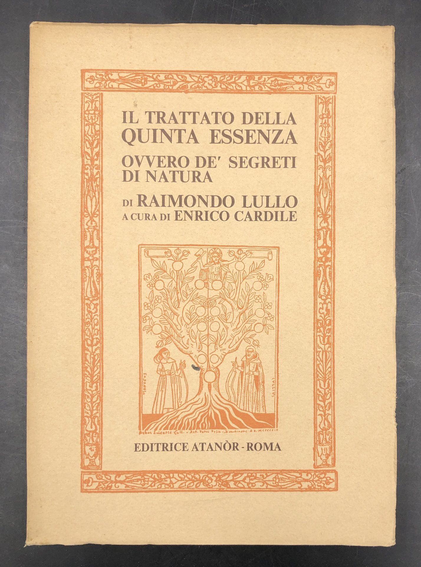 In 8° (cm. 21,4), pp. 159, (1). Brossura editoriale figurata con lemblema dell'Arbor Scientiae in cop. e al frontespizio. 41 pagine di introduzione bio-bibliografica. Come tutte quelle alchemiche attribuite a Lullo; pera apocrifa; di cui questa NON è una traduzione, perché il testo antico è oscuro, incompleto e intraducibile, ma una interpretazione in base a un complesso di altre opere. LULLO, Ramon LLULL (Palma di Maiorca 1232 -1316) teologo, logico, astrologo, alchimista, mistico e missionario catalano, padre di due figli. convertito dopo una visione nel 1262 a una vita di penitenza e di predicazione, pur restando laico, al fine di convertire al cristianesimo i Musulmani e gli Ebrei, autore di 260 opere, traduttore di un'opera di logica dall'arabo, avverso all'Averroismo, e influenzato da Agostino e da correnti mistiche francescane. Come nuovo