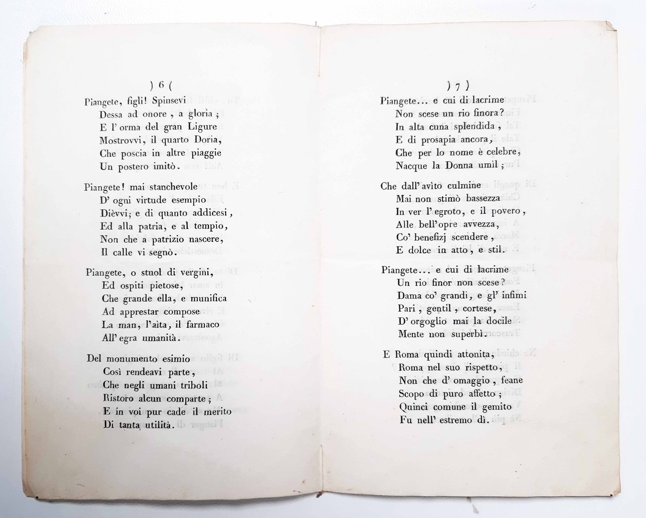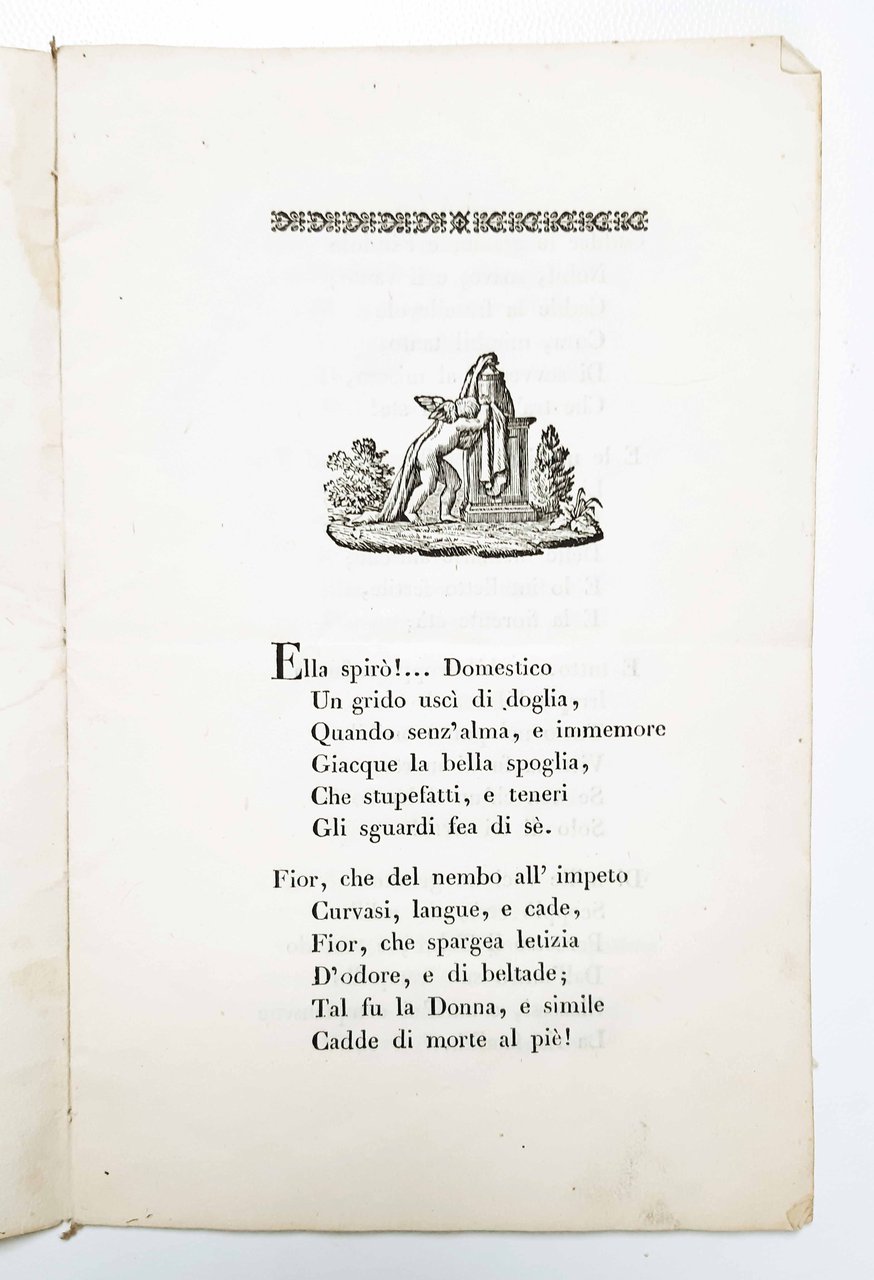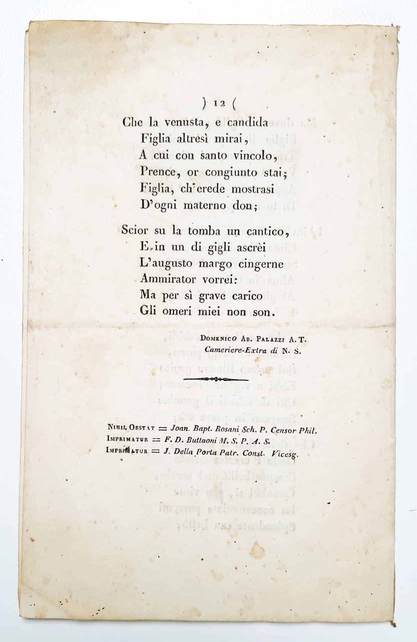 un fascicolo, cm 21,5 x 13,5; pp. 12; leg. senza coperta, con titolo in nero al front., testatina xilografica; segni d'uso e lievi macchie; il nome dell'Autore è indicato in fondo al testo (Domenico Ab. Palazzi A.T. Cameriere-Extra di N.S.); opera in condizioni generali molto buone.