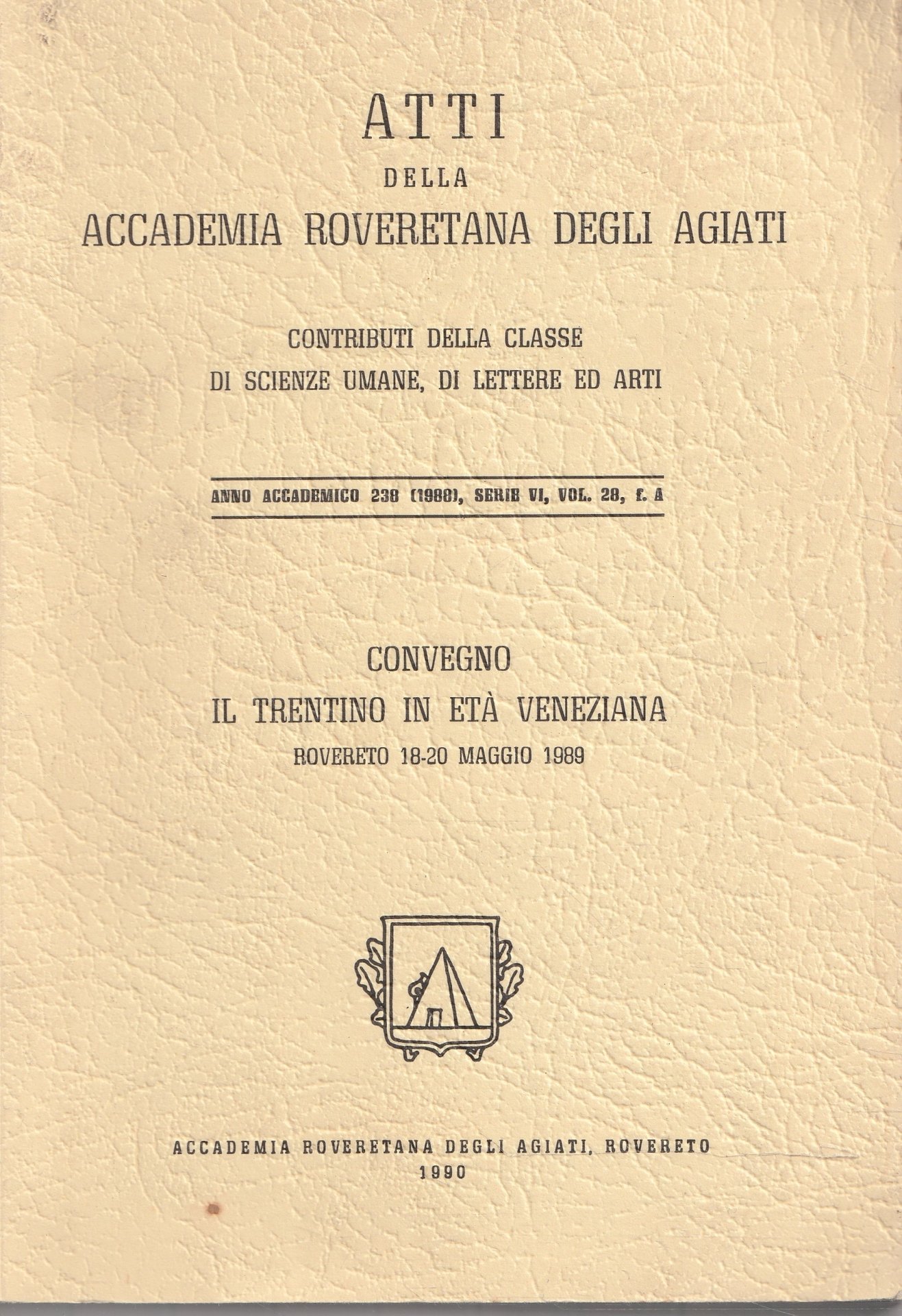 AP.29Brossura editoriale,Atti della Accademia Roveretana degli Agiati - Contributi della Classe di Scienze Umane, di Lettere ed Arti, a.a. 238 (1988), serie VI, vol.28, volume in buone condizioni, fatta eccezione per fioriture sulla costa superiore, copertina e interno in ottimo stato, legatura salda, 533 pagine circacopertina come da foto