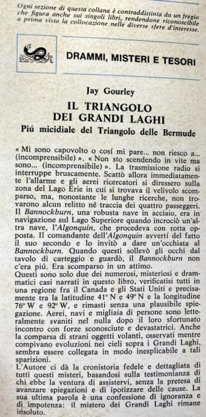 Soggetti: Ufologia, Misteri, Drammi, Naufragi, Grandi Laghi, Gialli, Thriller, Catastrofi, Incidenti aerei, Relitti, Passeggeri, Storie vere, Miti, Leggende, Bannockburn, Canada, Stati Uniti, Lago Erie, Cronache, Bestsellers, Sparizioni, Shipwrecks, North America, Aircraft accidents, History, Libri Vintage Fuori catalogo, Battle Creek, Michigan, Anni Cinquanta, CAB, Berlitz, Inland Seas, Alieni, UFO, Extraterrestri, Strumenti radio di bordo, Anomalie, Amnesie, Controllo, Viaggio, Teorie, Spiegazioni, Equipaggio, Piloti, Chicago Tribune, White Fish Bay, Milwaukee, Oggetti non identificati, Esseri intelligenti, Comando, N212AD, Archivi, Cinema, Twinkling Harm, Illinois, Indiana, Wisconsin, Harry C. Albrecht, Northwest Airlines, Inabissamenti, Lago Michigan, Collezionismo, Prime edizioni, Rarità, Libri rari, Testimonianze, Vittime, Ufology, Mysteries, Dramas, Shipwrecks, Great Lakes, Thrillers, Catastrophes, Plane accidents, Wrecks, Passengers, True stories, Myths, Legends, United States, Lake Erie, Chronicles, Disappearances, Out of print books, Fifties, Aliens, Extraterrestrials, On-board radio instruments, Anomalies, Amnesia, Control, Travel, Theories, Explanations, Crew, Pilots, Unidentified objects, Intelligent beings, Command, Archives, Drownings, Collectibles, First editions, Rarities, Rare books, Testimonies, Victims, Triangle