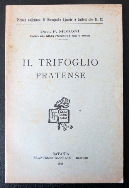 Francesco Battiato, Catania, 1916. Piccola Collezione di Monografie Agrarie e Zootecniche, N. 42. In 8vo, pp. 38 + 1 (Indice), bross. orig. in carta verdina. Leggero foxing marginale di copertina, molto buono tutto l'interno.