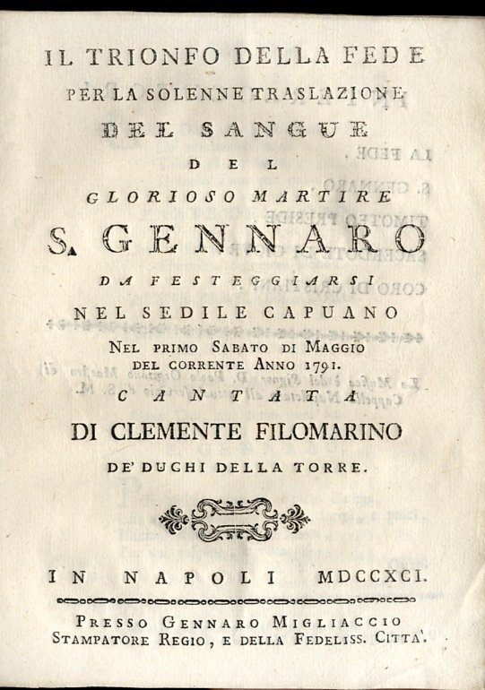 >8vo, pp. XIV, (2). Privo di brochure. Bella carta, ottimo stato. Non comune opuscolo sul miracolo di San Gennaro, il cui sangue pare si sia sciolto per la prima volta ai tempi di Costantino I, in occasione del trasferimento delle spoglie del santo dall'Agro Marciano, dove era stato sepolto, a Napoli. Le prime notizie storicamente documentate risalgono però soltanto al 1389 come riportato nel Chronicon Siculum (ma dal testo si può dedurre che doveva avvenire già da molto tempo).