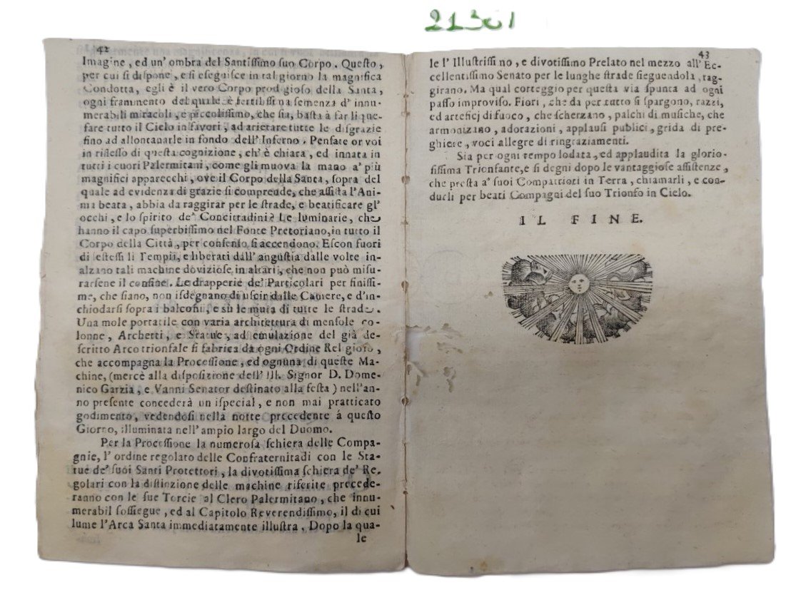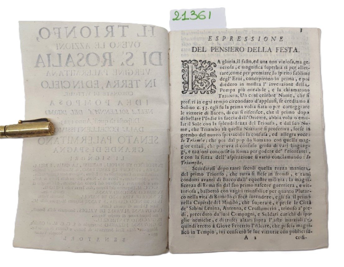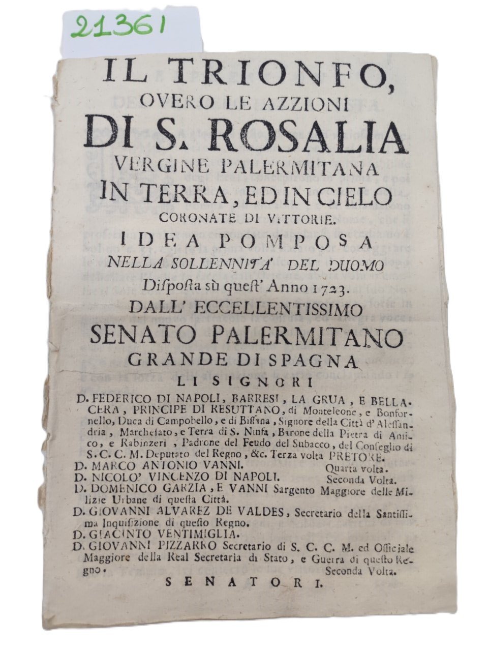 Il trionfo ovvero le azzioni di S. Rosalia vergine palermitana in terra, ed in cielo coronate di vittorie. Idea pomposa nella solennità del Duomo disposta su quest'anno 1723 dall'eccellentissimo Senato Palermitano Grande di Spagna