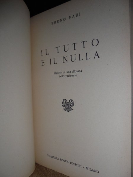 Il Tutto e il Nulla. Saggio di una filosofia dell' irrazionale. FABI, Bruno - Milano, Fratelli Bocca, 1952. Finito di stampare nelle Arti Grafiche Ponti & C., Milano, 1951. In-8° piccolo, cartoncino edit. 321 pp. prima edizione. Ben conservato. Neg. Filos.