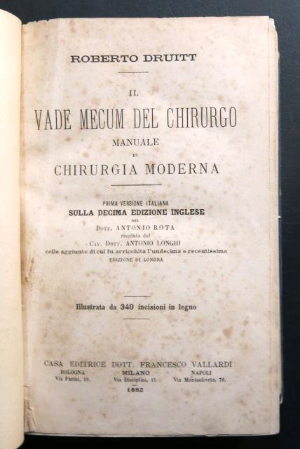 Casa Editrice Dott. Francesco Vallardi, Milano, 1882. Prima versione italiana sulla decima edizione inglese del Dott. Antonio Rota riveduta dal Cav. Dott. Antonio Longhi colle aggiunte di cui fu arricchita l'undecima e recentissima edizione di Londra. Illustrata da 340 incisioni in legno. In 8vo, pp. 903 (con Indice) + 1 (Errata Corrige) + pp. 48 (Appendice al testo) + 2 (Indice delle aggiunte), inc. in legno in b/n n. t., coeva e modesta leg. in cartonato blu muto. Elegante timbretto di privata appartenenza alla prima bianca. Segni di usura agli angoli della legatura, rinforzate le cerniere, uniformemente ingiallito con alcuni punti di foxing ma buono il volume.