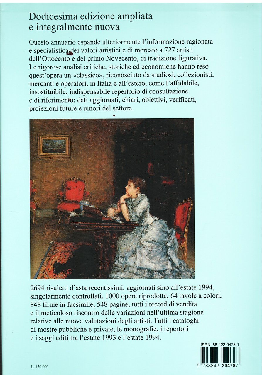(XII edizione) 4° carton. edit. sovrac. figur. pp. 548, (20). 727 artisti dell'800 e primo 900, con 2694 risultati d'asta, 1000 opere riprodotte, 64 tavole a colori, 864 firme in facsimile, tutti i cataloghi di mostre, monografie, repertori, tutti i record di vendita.Ottimo esempl.