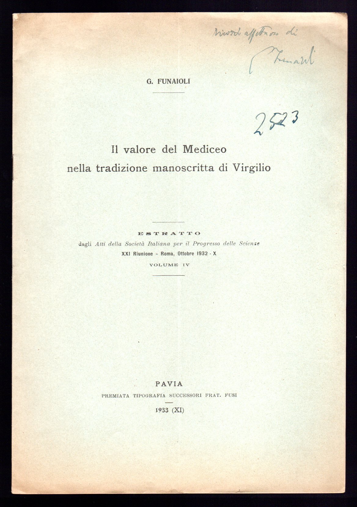 Opuscolo vintage. Estratto dagli Atti della Società italiana per il progresso delle Scienze - XXI Riunione - Roma - ottobre 1932 - X - Vol. IV. Dedica autografa dell'autore. Intonso e in quarta francobollo. Piega centrale. Ordinario segno del tempo.