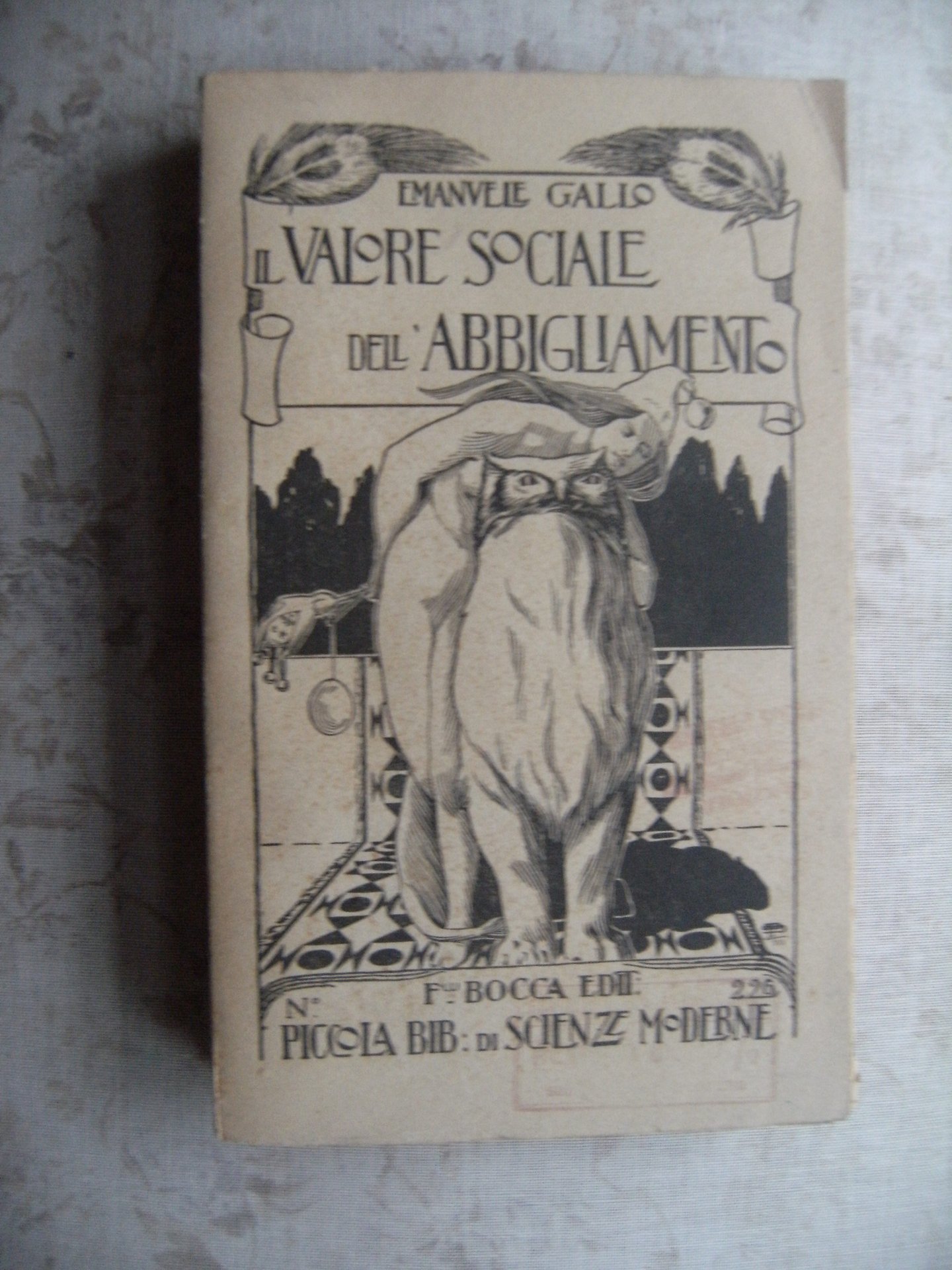 Libro di pag. 331 + 50 pag. di bibliografia e norme suntuarie. Brossura con bella copertina di stampo liberty. Una delle prime analisi italiane sull'importanza sociale della moda. Esemplare ben conservato di un'opera non comune.