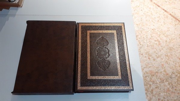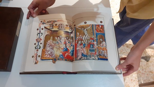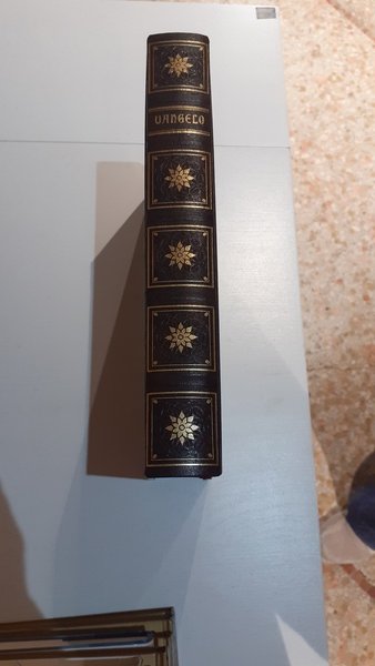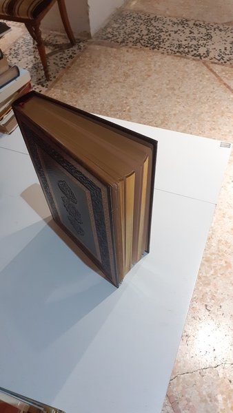 29x20. Copertina rigida in pelle con dettagli e taglio in oro. In ottime condizioni. Le miniature sono riprodotte in fac-simile da codici membranacei del XIII, XIV, XV, XVI secolo. Le tavole della Palestina e del Tempio di Gerusalemme nell'introduzione sono del pittore Carlo Nicco. Le iniziali a colori sono di Mario Fina. Compreso di cofanetto con interno in tessuto.