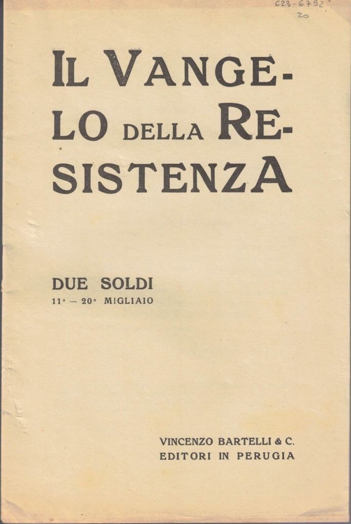 Il Vangelo della Resistenza, Vincenzo Bartelli e C. Editori, Perugia s.d. (pref. 1915), pp. 32, cm 25, pubblicazione spillata. Collana Due soldi. Pubblicazione anonima a carattere patriottico. Indice: La Resistenza e la parabola delle formiche – la Resistenza della parabola e la parabola dei vignaiuoli – Decalogo del soldato che parte per la guerra – Lo spionaggio ed il contrabbando – Decalogo del soldato ferito – La Resistenza dell’azione quotidiana – L’organizzazione economica del Paese, le industrie, i traffici, le esportazioni, la disoccupazione, l’agricoltura e la guerra – I tre decaloghi degli agricoltori – la leva in massa della beneficenza – La Resistenza ed i doveri della donna – La Resistenza ed i doveri degli italiani all’estero – L’emblema della Resistenza. Perfetto, intonso. Non comune.