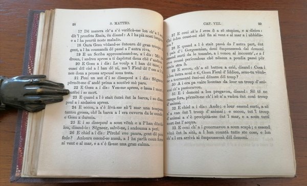 (Dialettologia italiana - Piemonte - Testi biblici - Vangelo secondo Matteo - Traduzioni piemontesi - Luigi Luciano Bonaparte) Cm 14 x 11, legatura in mezza pelle, guardie in carta pavone, taglio di testa dorato, pp. (6),130,(4). Stampato in 250 copie. Ottimo stato di conservazione. Edizione originale del 1861.