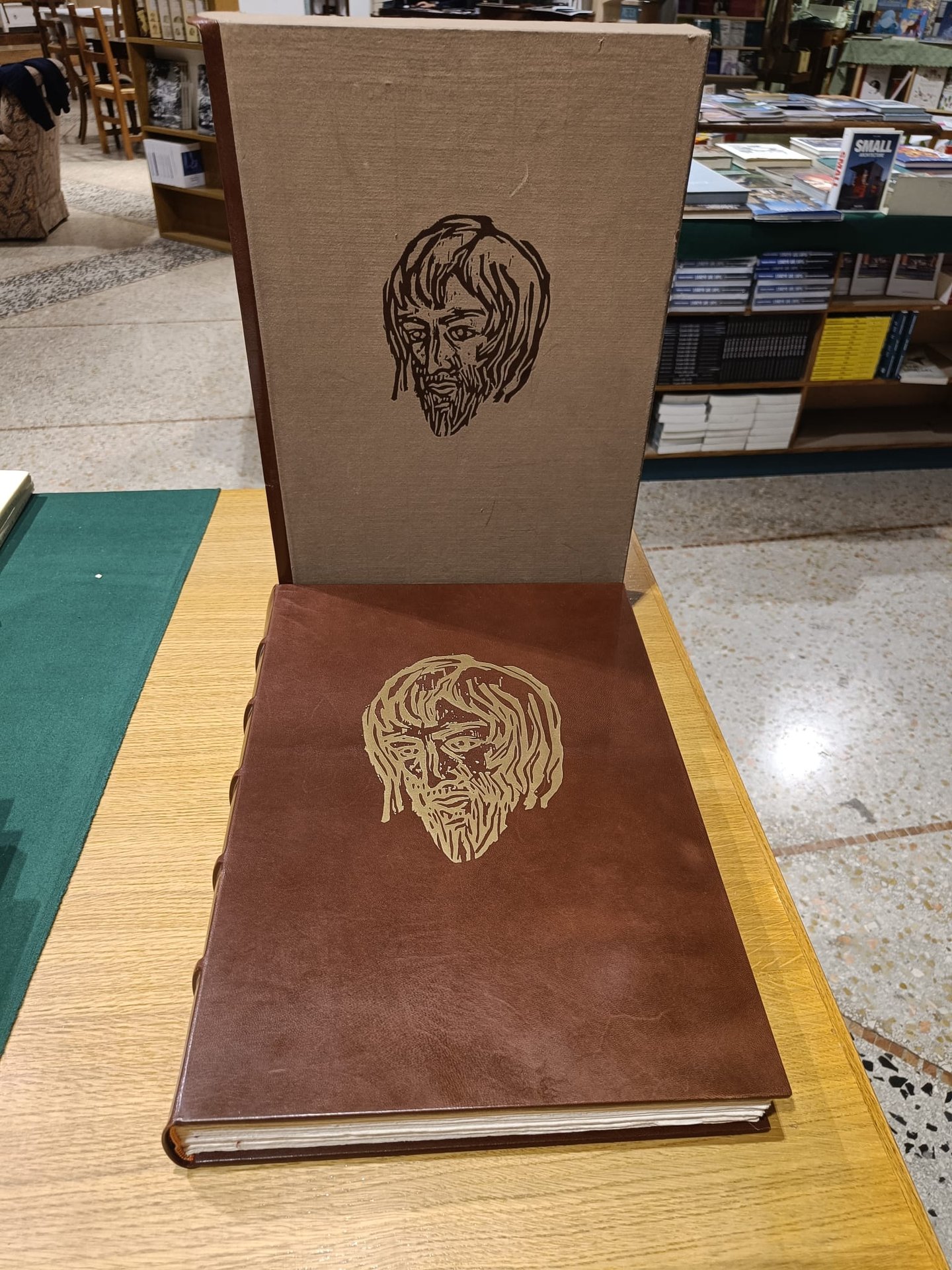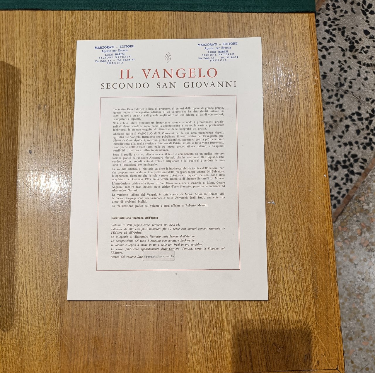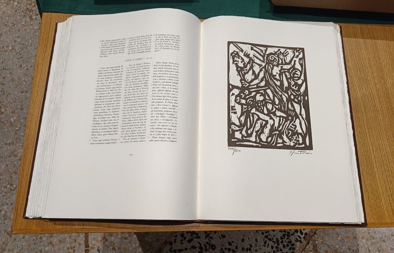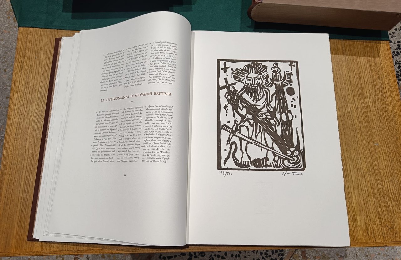 Vangelo secondo Giovanni realizzato tramite procedimenti artigianali di alcuni secoli fa (composizione a mano, carta appositamente fabbricata, stampa eseguita diorettamente dalle xilografie dell'artista). Presenta 58 xilografie dell'incisore Alessandro Nastasio presentate da Jean Bouret. Introduzione critica su San Giovanni di Mons. Cesare Angelini. Esemplare n. 279. Volume legato a mano in tutta pelle con fregi in oro zecchino.