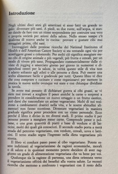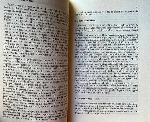 Soggetti: Manuali, Guide pratiche, Diventare vegetariani, Vegetarianismo, Vegetarianesimo, Veganesimo, Veganismo, Ricette, Consigli pratici, Stadi, Pass-passo, Carne, Abolire, Pesce, Sostituzioni, Sostituire, Pasti, Alimentazione, Diete, Ospitalità, Ospiti, Allergie, Intolleranze, Legumi, Verdure, Contorni, Piatti unici, Primi, Secondi, Contorni, Dolci, Cibo, Proteine vegetali, Fabbisogno proteico, Integrazione, Pollo, Uova, Formaggi, Pesce, Cereali, Macrobiotica, Etica, Filosofia alimentare, Ecologia, Ambiente, Biologico, Cucina vegetariana, Ricettario, Dietetica, Vegetarian steg för steg, Cucina, Mangiare sano, Cucinare, Alimenti proibiti, Idee, Mangiare fuori, Ristoranti, Glutine, Lievito, Calorie, Energia, Grassi, Carboidrati, Vitamine, Transizione, Poultry, Merenda, Colazione, Pranzo, Cena, Metodi di cottura, Bollitura, Arrosto, Griglia, Frittura, Piastra, Forno, Vapore, Zucca, Piselli, Hummus, Tahina, Ceci, Fagioli, Passate, Zuppe, Brodo, Vellutate, Dip, Antipasti, Aglio, Sesamo, Spezie, Salse, Pizza, Pane, Burro, Olio, Funghi, Sale, Zucchero, Benessere, Cura di sé, Libri Vintage Fuori catalogo, Classici, Successi editoriali, Bestsellers, Soluzioni alimentari, Stile di vita, Cambiamento, Regime alimentare vegetariano, Casa, Combinazioni, Divisioni, Tempo libero, Hobby, Alimentazione personalizzata, Controllo, Dieta mediterranea, Tempeh, Zucche, Stati Uniti d'America, Scrittrici americane, Yogurt, American Cancer Society, Anni Ottanta, Carni rosse, Agnello, Topinambur, Patate, Rape, Cicoria, Spinaci, Sakè, Alcolici, Vino, Birra, Amidi, Avocado, Frutta, Etichette, Porzioni, Proporzioni, Latticini, Muco, Freschi, Stagionalità, Biscotti, Uvetta, Muffin, Padella, Pancake, Involtini, Cavolo, Casseruola, Tahini, Tofu, Miso, Soia, Aceto, Lime, Riso, Limone, Tamari, Tandoori, Baba Ganoushi, Melanzane, Creme, Borsch, Internazionali, Orientali, Mediorientali, Kombu, Alghe, Carciofi, Cannella, Wakame, Umeboshi, Prezzemolo, Barbabietole, Dal, Crunch, Lenticchie, Indiana, Insalate, Caesar, Guacamole, Kacha, Greca, Gomasio, Paella, Omelette, Moussaka, Ratatouille, Noci, Frutta secca, Chili, Curry, Quiche, Tonno, Scatolame, Mais, Carruba, Gelatina, Colla, Tempura, Farina, Mais, Torte, Marinatura, Azuki, Cipolle, Medaglioni, Soffritto, Spaghetti, Linguine, Carote, Avanzi, Pudding, Mele, Crostate, Pangrattato aromatizzato, Fagiolini, Lasagne, Fettuccine, Tagliatelle, Frittata, Vaniglia, Taccole, Champignon, Bouillabaisse, Arachidi, Moussaka, Spiedini, Felafel, Involtini cinesi primavera, Ravioli, Ricotta, Spanakopita, Kudzu, Pirogi, Hikizi, Miglio, Grano, Avena, Latte, Comportamento alimentare, Spesa, Gourmet, Baba ganush, Culinaria, Manuals, Practical guides, Becoming vegetarian, Vegetarianism, Veganism, Recipes, Practical advice, Stages, Pass-step, Meat, Abolish, Fish, Substitutions, Replace, Meals, Nutrition, Diets, Hospitality, Guests, Allergies, Intolerances , Legumes, Vegetables, Side dishes, Singles, First courses, Seconds, Side dishes, Sweets, Food, Vegetable proteins, Protein requirements, Integration, Chicken, Eggs, Cheese, Fish, Cereals, Macrobiotics, Ethics, Food philosophy, Ecology, Environment, Organic, Vegetarian, Cookbook, Dietetics, Cuisine, Healthy eating, Forbidden foods, Ideas, Eating out, Restaurants, Gluten, Yeast, Calories, Energy, Fats, Carbohydrates, Vitamins, Transition, Snack, Breakfast, Lunch, Dinner, Cooking methods, Boiling, Roast, Grill, Frying, Plate, Oven, Steam, Pumpkin, Peas, Chickpeas, Beans, Past, Soups, Broth, Velvety, Appetizers, Garlic, Sesame, Spices, Sauces, Bread, Butter, Oil, Mushrooms, Salt, Sugar, Wellness, Self-care, Out of print books, Classics, Editorial successes, Bestsellers, Food solutions, Lifestyle, Change, Home, Combinations, Divisions, Leisure, Personalized nutrition, Control, Mediterranean Diet, Pumpkins, American writers, Eighties, Red meat, Lamb, Potatoes, Turnips, Chicory, Spinach, Alcohol, Wine, Beer, Starches, Fruits, Labels, Portions, Proportions, Dairy products, Mucus, Fresh, Seasonality, Cookies, Raisins, Pan, Rolls, Cabbage, Casserole, Soy, Vinegar, Lime, Rice, Lemon, Eggplant, Creams, International, Oriental, Middle Eastern, Seaweed, Artichoke, Cinnamon, Parsley, Beetroot, Lentils, Indian, Salads, Greek, Nuts, Dried fruit, Tuna, Tins, Corn, Jelly, Glue, Flour, Corn, Cakes, Marinade, Onions, Medallions, Sautéed, Carrots, Leftovers, Apples, Tarts, Flavored Breadcrumbs, Green Beans, Vanilla, Jackdaws, Peanuts, Skewers, Chinese rolls, Millet, Wheat, Oats, Milk, Eating behavior, Shopping, Culinary, Gastronomia, Gastronomy