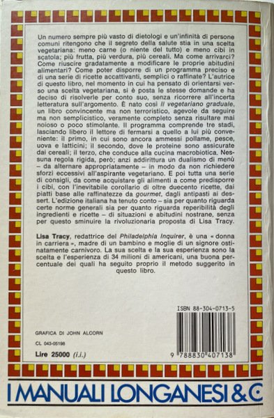 Un numero sempre più vasto di dietologi e un'infinità di persone comuni ritengono che il segreto della salute stia in una scelta vegetariana: meno carne (o niente del tutto) e meno cibi in scatola; più frutta, più verdura, più cereali. Ma come arrivarci? Come riuscire gradatamente a modificare le proprie abitudini alimentari? Come poter disporre di un programma preciso e di una serie di ricette accattivanti, semplici o raffinate? L'autrice di questo libro, nel momento in cui ha pensato di orientarsi verso una scelta vegetariana, si è posta le stesse domande e ha deciso di risolverle per conto suo, senza ricorrere all'incerta letteratura sull'argomento. È nato così Il vegetariano graduale, un libro convincente ma non terroristico, agevole da seguire ma non semplicistico, veramente completo senza risultare mai noioso o poco stimolante. II programma comprende tre stadi, lasciando libero il lettore di fermarsi a quello a lui più conveniente: il primo, in cui sono ancora ammessi pollame, pesce, uova e latticini; il secondo, dove le proteine sono assicurate dai cereali; il terzo, che conduce alla cucina macrobiotica. Nessuna regola rigida, però; anzi addirittura un dualismo di menù.