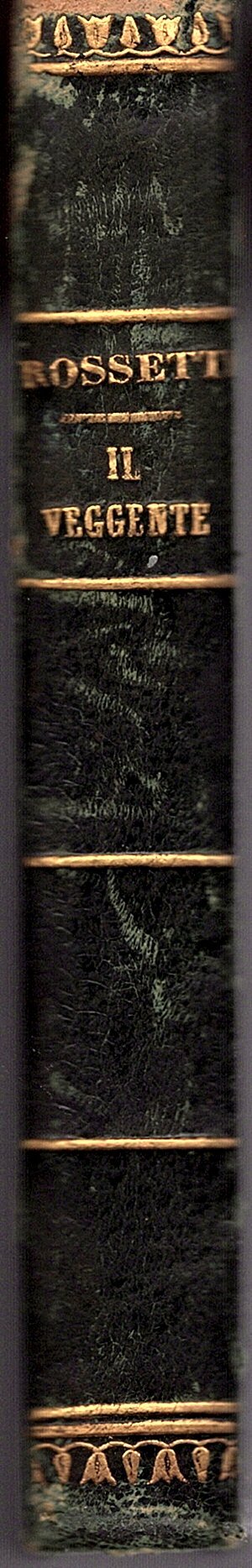 In-16°, pp. 411, legatura dell'epoca in m. pelle verde con titolo in ro sul dorso. Frontespizio con titolo e vignetta effigiante un angelo entro bordura ornamentale. Bell'esemplare. Edizione contemporanea all'originale del François di Parigi, stampata con falso luogo 'Italia' e preceduta da uno scritto di Giuseppe Ricciardi; 'contraffazione dell'edizione originale dello stesso anno stampata probabilmente in Francia' (Parenti). Il poemetto patriotico di Rossetti, il grande letterato, critico e patriota padre di Dante Gabriel e di Christina Rossetti, preceduto dal prologo 'Alla verità', è costituito da 2 'novene' in versi polimetri, ognuna delle quali divisa in 9 giornate: 1°Novena - 1°giorno: Ingresso nella solitudine e proponimenti del solitario; 2.Nei campi, riflessioni varie; 3.Nella biblioteca, riflessioni varie; 4°.Il genio feudale e il genio filantropico; 5.Orgie levitiche; 6.Il monte delle visioni; 7.Il congresso delle ombre, 8. Il pio pastore e i 2 poeti; 9.Depravazione del culto di Cristo e miserie d'Italia. - II.Novena - 1°giorno: La Costituzione di Napoli del 1820; 2.Fuga ed esilio; 3.Viaggio da Malta in Inghilterra; 4.L'ombra di Dante; 5.Stanza in Inghilterra (1824) e rivoluzione in Francia (1830); 6.Nuovi tentativi politici in Italia e nuove miserie; 7.Il futuro dipinto come presente del monte delle visioni; 8.L'Italia si libera dal tirannico giogo politico; 9.L'Italia silibera dal giogo dommatico che la degrada. Parenti, Luoghi di stampa falsi, p. 225. Cfr., per la prima edizione, Parenti, p. 438 e Biancardi / Francese, p. 390.