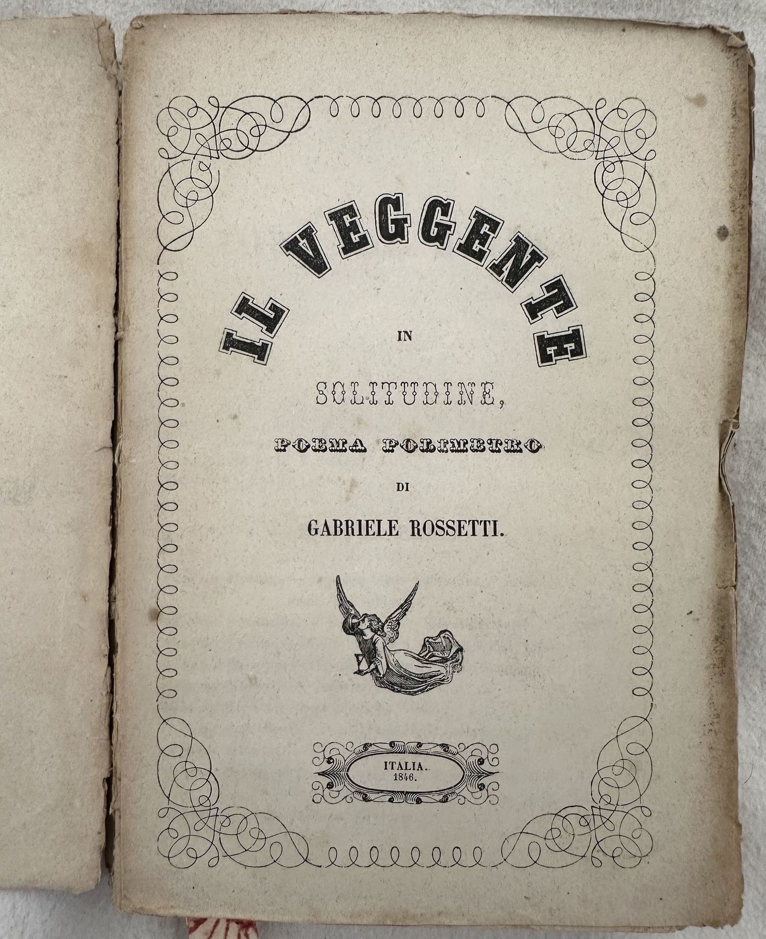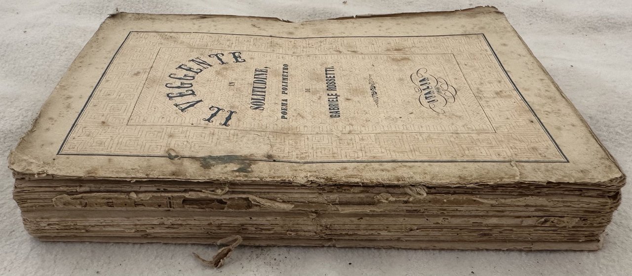 Rara opera poetica di Gabriele Rossetti (1783-1854) poeta, critico letterario e patriota italiano. Appoggiò i moti liberali del 1820 e per questo motivo venne esiliato dall'Italia. Andò a vivere prima a Malta poi in Inghilterra. La gran parte delle sue opere vennero censurate ed inserite all'indice dei libri proibiti per le tematiche anticlericali e massoniche. Prima edizione italiana contraffatta stampata nel 1846, lo stesso anno della prima assoluta pubblicata a Parigi. Tra i poemi presenti: Nella bibliolteca, Il genio feudale, Orgie levitiche, Depravazione del culto di Cristo e miserie d'Italia, La costituzione in Napoli nel 1820, Viaggio da Malta in Inghilterra, L'ombra di Dante,Nuovi tentativi politici in Italia, il futuro dipinto come presente dal monte delle visioni, L'Italia si libera dal tirannico giogo politico, L'Italia si libera dal giogo dommatico che la degrada ec. In buone condizioni e completo. Copertina editoriale in buone condizioni generali con lievi usure ai margini e dorso. Legatura in buone condizioni. All'interno le pagine si presentano in buone condizioni con fioriture. Alcuni strappi all'ultima pagina 411 senza perdita di testo. In 16. cm. 16,5x11. Pp. (8)+411+(1).Scarce poetical work of Gabriele Rossetti (1783-1854) poet, litterary critic and italian patriot. He helps the liberal movements of 1820 and for this reason was exiliated from Italy. He went to Malta then in England. The greatest part of his works, as this one, were censored and put at the Index for the anti-clerical and freemasonry themes. It contains also an appendix. It is a study about Rome in the first half of XIX century, with an open criticize against the Catholic Church that according to the author blocked the development of Rome and Italy. The poems inside: Nella bibliolteca, Il genio feudale, Orgie levitiche, Depravazione del culto di Cristo e miserie d'Italia, La costituzione in Napoli nel 1820, Viaggio da Malta in Inghilterra, L'ombra di Dante,Nuovi tentativi politici in Italia, il futuro dipinto come presente dal monte delle visioni, L'Italia si libera dal tirannico giogo politico, L'Italia si libera dal giogo dommatico che la degrada ec. In good general conditions and complete Editorial cover in good conditions lightly worn in the extremities. Binding in good conditions. Inside pages are in good conditions with foxing. Some tears in the last page 411 with no loss of text. In 16. cm. 16,5x11. Pp. (8)+411+(1).