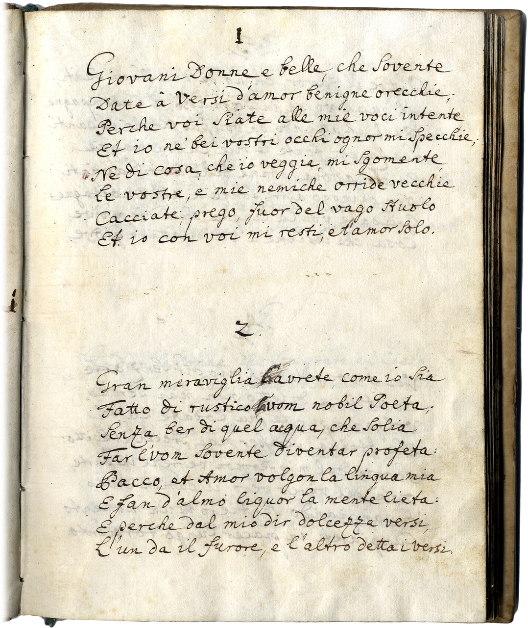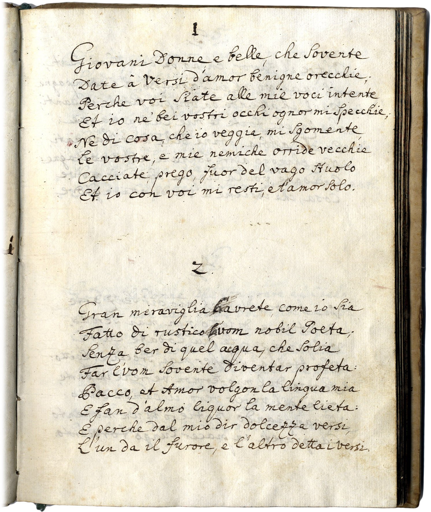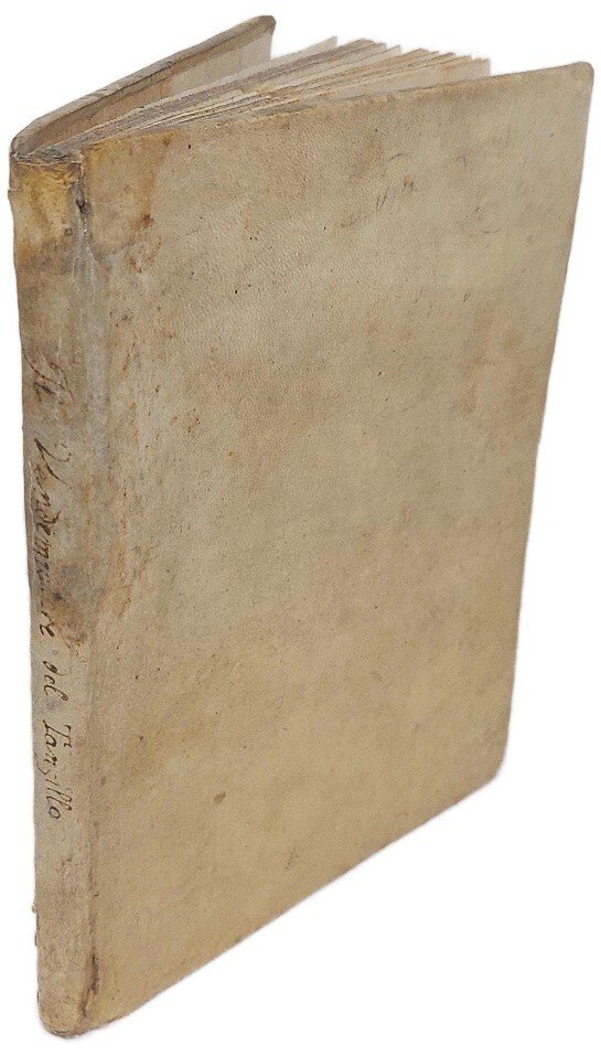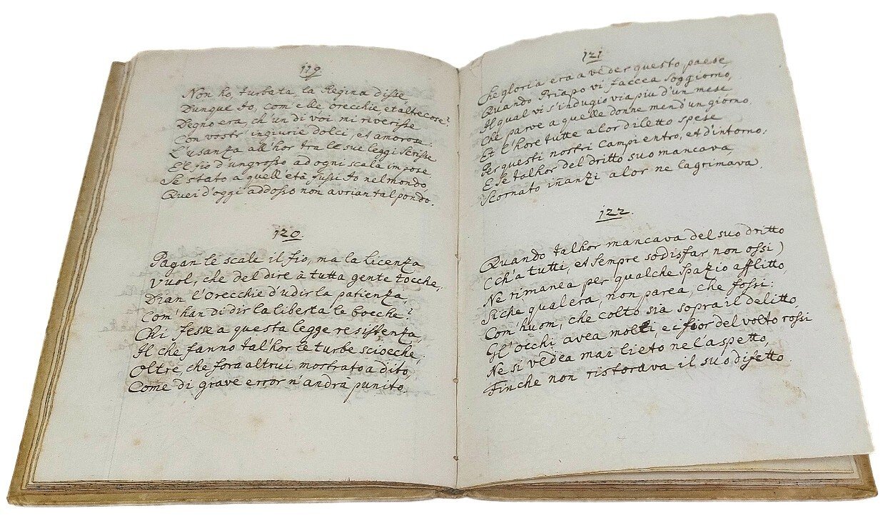 >in-8 (mm 196x150), ff. 44 n.n., vergati in bella e chiara su entrambe le facciate. Legatura coeva in pergamena rigida, titolo manoscritto lungo il dorso. Poemetto erotico in ottava rima di tono popolaresco, pubblicato nel 1537 col titolo ''Stanze di coltura sopra gli horti delle donne'' e messo all'Indice in quello stesso anno: questo favorì indubbiamente una incredibile proliferazione di copie manoscritte non autorizzate, come non autorizzata e per di più manipolata fu la princeps napoletana del 1534. Questo manoscritto si compone da 171 ottave, come gli esemplari a stampa e manoscritti più antichi, a differenza di edizioni successive, che ne hanno 183. Il vendemmiatore, dall'alto di un olmo, si rivolge alle donne giovani e belle invitandole a godere i piaceri dell'amore, sotto la metafora della coltivazione degli orti. Luigi Tansillo (Venosa, Napoli, ca. 1510-1568) fu uno dei più validi poeti italiani del XVI sec., da alcuni considerato il creatore del dramma pastorale; prima ''Il vendemmiatore'' (1534) e poi (1550) tutte le sue opere furono messe all'Indice; per riconquistare il favore della Chiesa compose il poema sacro ''Le lagrime di San Pietro''. Al contropiatto anteriore ex libris Josephi Maria Parascandolo ( Inter libros / Josephi Mariae Parascandolo / AntecessorisRegii / A. L. N ) archeologo e grecista italiano. Qualche sporadica macchietta chiara nel margine bianco.