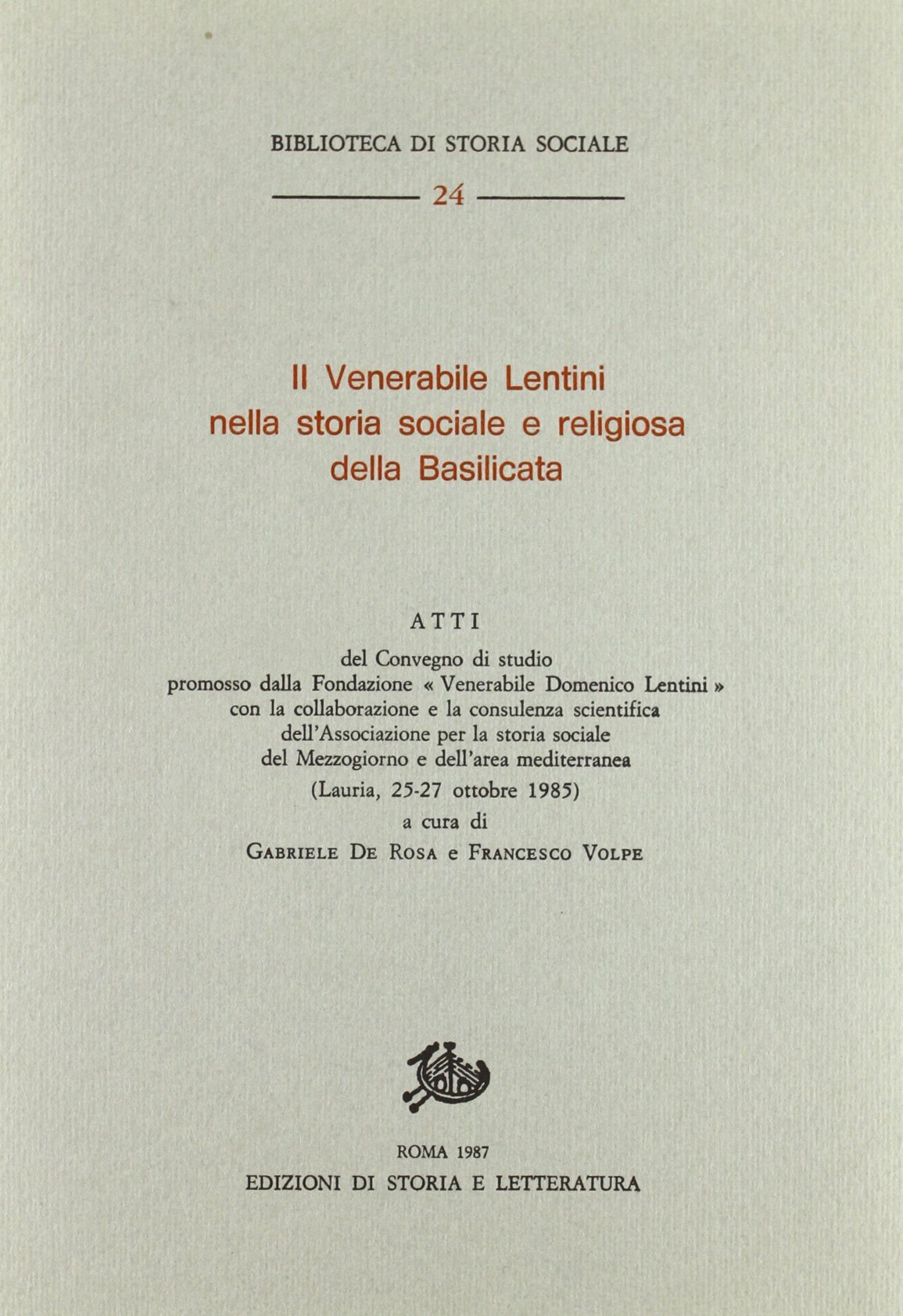 Il Venerabile Lentini nella Storia sociale e religiosa della Basilicata. Roma, Storia e Letteratura 1987, 25 308 302 p. ; 25 cm. (59183)