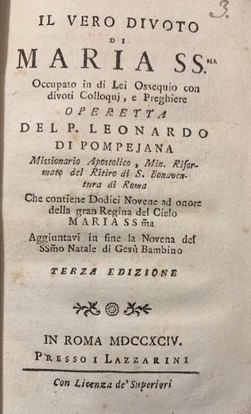 Il Vero Divoto di Maria SS.ma, Occupato in di Lei Ossequio con divoti Colloquj, e Preghiere Operetta del P. Leonardo di Pompejana, Missionario Apostolico, Min. Riformato del Ritiro di S. Bonaventura di Roma che contiene Dodici Novene ad onore della