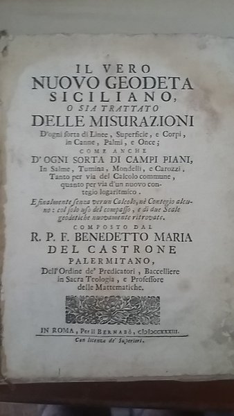 IL VERO NUOVO GEODETA SICILIANO, O SIA TRATTATO DELLE MISURAZIONI D'OGNI SORTA DI LINEE, SUPERFICIE, E CORPI, IN CANNE, PALMI, E ONCE; COME ANCHE D'OGNI SORTA DI CAMPI PIANI, IN SALME, TUMINA, MONDELLI, E CAROZZI, TANTO PER VIA DEL CALCOLO COMMUNE, QUANTO PER VIA D'UN NUOVO CONTEGIO LOGARITMICOSEGUE PROBLEMI AGGIUNTI AL NUOVO GEODETA SICILIANO