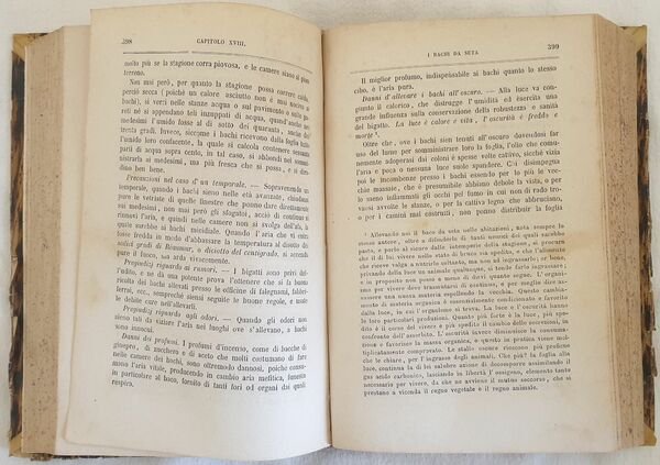 Edizione del 1871 di questo interessante manuale per la vita in campagna scritto da Antonio Balbiani ad uso del fattore, contadino, allevatore del bestiame, giardiniere, bigattiere, fabbricatore di vino. Gli autori descrivono la vita del contadino, pregi e vantaggi della vita campestre, alimentazione (differenziando perfino quella del contadino di Reggio o di Piacenza), Terre coltivabili, vari tipi di animali da allevamento (buoi vacche, verri e scrofe, cavalli asini e muli, coniglio), gelsi, bachi da seta, orto, frutteto, vite, vino, api, giardino ecc. In buone condizioni. Copertina in mezza pergamena coeva con titolo manoscritto al dorso in buone condizioni generali con lievi usure ai margini e dorso. Legatura in buone condizioni. Pagine in buone condizioni con fioriture. In 8. cm 24x16. Pp. 1118+(1).Edition of 1871 of this interesting manual for life in countryard written by Antonio Balbiani for the usage of agriculturer, peasant, breeder of cattle, gardener, wine maker. the authors describe the life of peasant, advantages of countryard life, Food (making different between that of Reggio or Piacenza), cultivated lands, different kind of breeding animals , garden, silkworms ecc. In good conditions. Half parchment coeval cover with handwritten title in the spine in good conditions lightly worn in the extremities and spine. Binding in good conditions. Pages in good conditions with foxing. In 8. cm 24x16. Pp. 1118+(1).