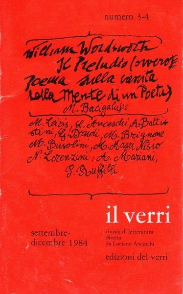 Il Verri n. 3-4. Settima serie, prima edizione 1984, pp. 194, formato 11,5 x 18,5.<BR>Copertina morbida illustrata di colore rosso con titoli in nero al piatto anteriore e sul dorso. Rivista di letteratura diretta da Luciano Anceschi.In questo numero: Bagigalupo, Leiris, Anceschi, Battistini, Bellerini, Drudi, Brignone, Busolin, Lorenzini, Mariani, Ruffili.<BR>Piccoli segni di usura al piatto anteriore e sul dorso. Nel complesso condizioni molto buone.