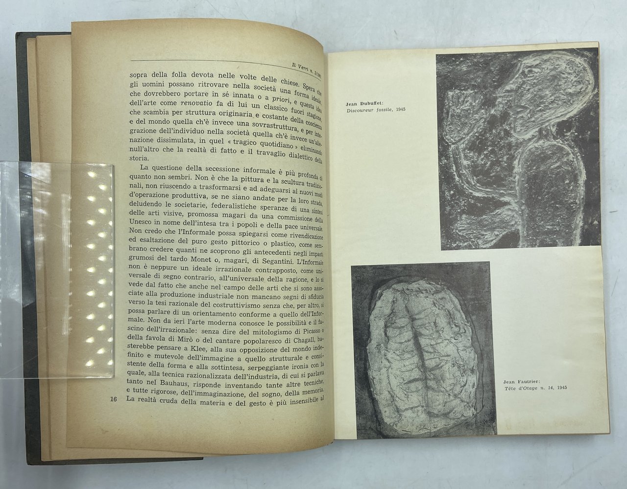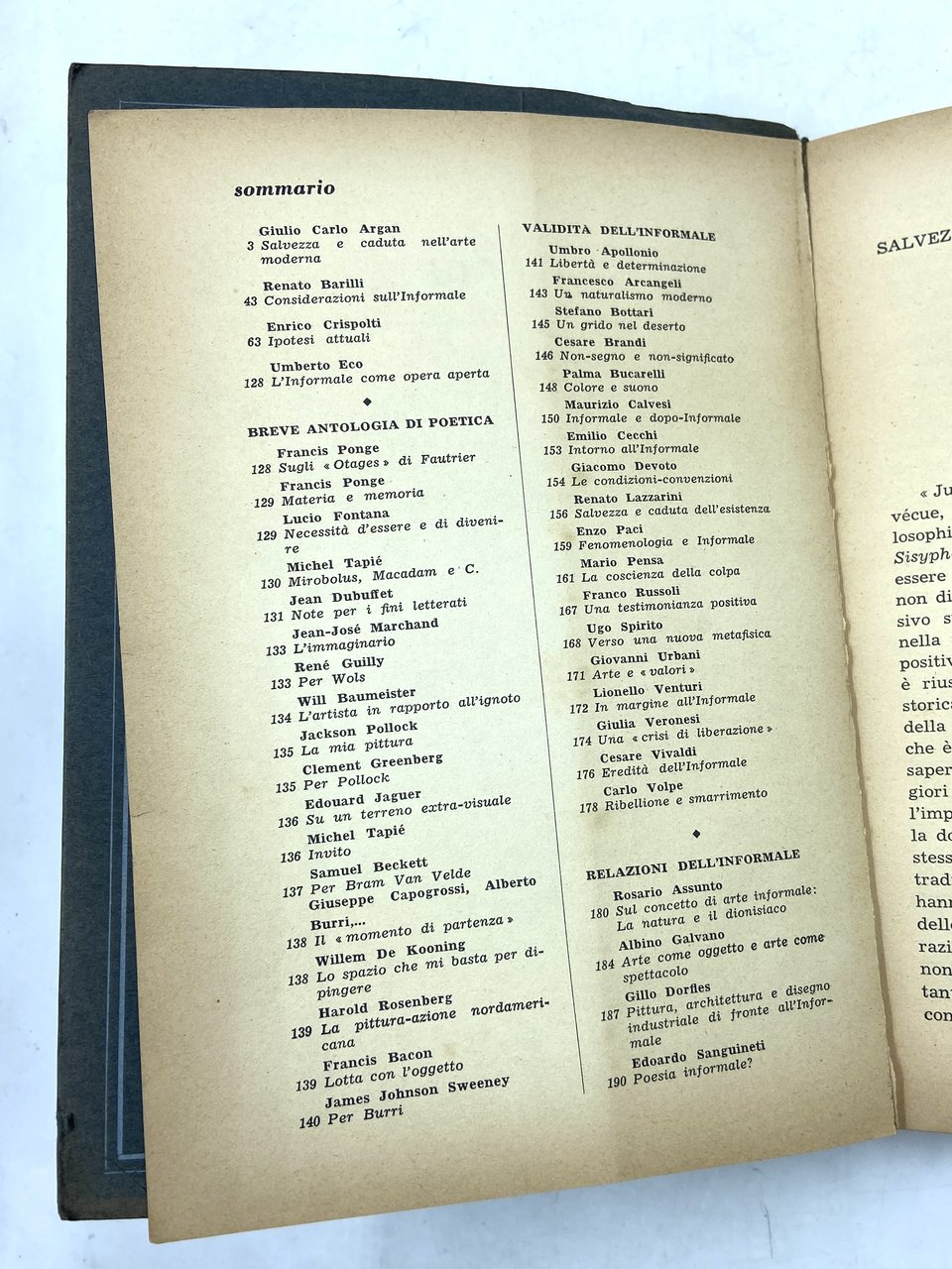 Brossura editoriale con risvolti (lievi gore e bruniture), cm 20.5 x 15.5, pp 194 (18), 12 tavole in nero. Discreto esemplare da studio. Fascicolo monografico di una delle più significative riviste letterarie italiane del secondo Novecento, fondata da Luciano Anceschi nel 1956 e molto vicina al Gruppo 63 con Nanni Balestrini, Renato Barilli, Alfredo Giuliani, Leo Paolazzi e Giuseppe Pontiggia nel comitato di redazione. Nel 1961 Il Verri raccolse i più importanti critici e intellettuali italiani in questa atipica monografia che è rimasta uno strumento imprescindibile per comprendere l'esperienza dell'informale, l'espressionismo astratto e i fermenti artistici all'alba degli anni '60. La prima parte del volume raccoglie saggi di maggior respiro di Giulio Carlo Argan (Salvezza e caduta nell'arte moderna), Renato Barilli (Considerazioni sull'Informale), Enrico Crispolti (Ipotesi attuali) e Umberto Eco (L'Informale come opera aperta); la seconda sezione è dedicata ad una Breve antologia di poetica con testi di artisti e critici: Francis Ponge, Lucio Fontana, Michel Tapié, Jean Dubuffet, Jean-José Marchand, René Guilly, Will Baumeister, Jackson Pollock, Clement Greenberg, Eduard Jaguer, Samuel Beckett, Giuseppe Capogrossi, Alberto Burri, Willem De Kooning, Harold Rosenberg, Francis Bacon, James Johnson Sweeney. La terza parte, intitolata Validità dell'Informale, vede contributi di Umbro Apollonio, Francesco Arcangeli, Stefano Bottari, Cesare Brandi, Palma Bucarelli, Maurizio Calvesi, Emilio Cecchi, Giacomo Devoto, Renato Lazzarini, Enzo Paci, Mario Pensa, Franco Russoli, Ugo Spirito, Giovanni Urbani, Lionello Venturi, Giulia Veronesi. Cesare Vivaldi, Carlo Volpe. Relazioni dell'Informale è il titolo del segmento conclusivo del fascicolo, con scritti di Rosario Assunto, Albino Galvano, Gillo Dorfles ed Edoardo Sanguineti.