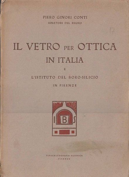 Brossura, composta da tre parti: Il vetro per l'ottica in Italia, 60 pg. con 12 Illustrazioni fuori testo di Emilio Toti + I° Catalogo dei vetri per ottica edito dall'l'Istituto del boro-silicio, 8 pg. + Istituto del boro-silicio, Firenze, 39 tavole b/n. Stampato in 2500 esemplari. CONDIZIONI!