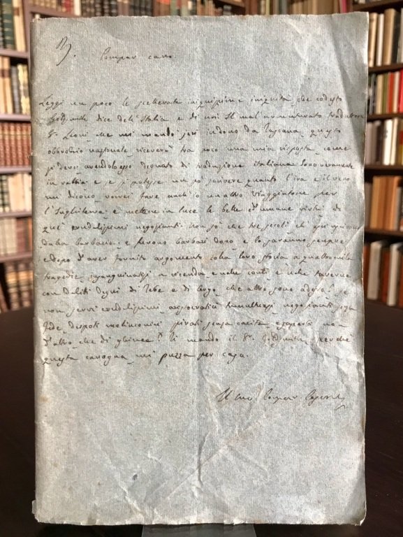 In-8° (cm. 23,3), brossura azzurra coeva con piatto anteriore anticamente manoscritto (sprezzante presentazione del poema con proposito di replica); pp. 47 [1] in ottimo stato e in barbe (sporadiche fioriture). Al piatto il seguente invito di un letterato ad un amico: «Leggi un poco le scellerate iniquissime iniquità che codesto Goldsmith dice dell'Italia e di noi. Il mal avventurato traduttore Leoni che mi mandò ieri in dono da Toscana questo obbrobrio nazionale riceverà fra poco una mia risposta [.]. Vi mando il 8° di Goldsmith perché questa carogna mi puzza per casa». Ottimo esemplare.
