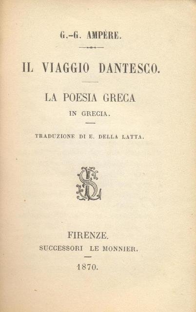 Firenze, Successori Le Monnier, 1870. Traduzione di E. Della Latta. In 12esimo, pp. IX, 418 con Indici, leg. in pelle rossa con fregi e titoli in oro al dorso, punte, solo una parte dei soli piatti è in percallina rossa, contropiatti e fogli di guardia in carta spessa decorata. Solida ed elegante leg. edit. Il primo testo, assai utile compendio, è la descrizione dei luoghi citati da Dante nella Commedia. Ottimo, curioso e piacevole.