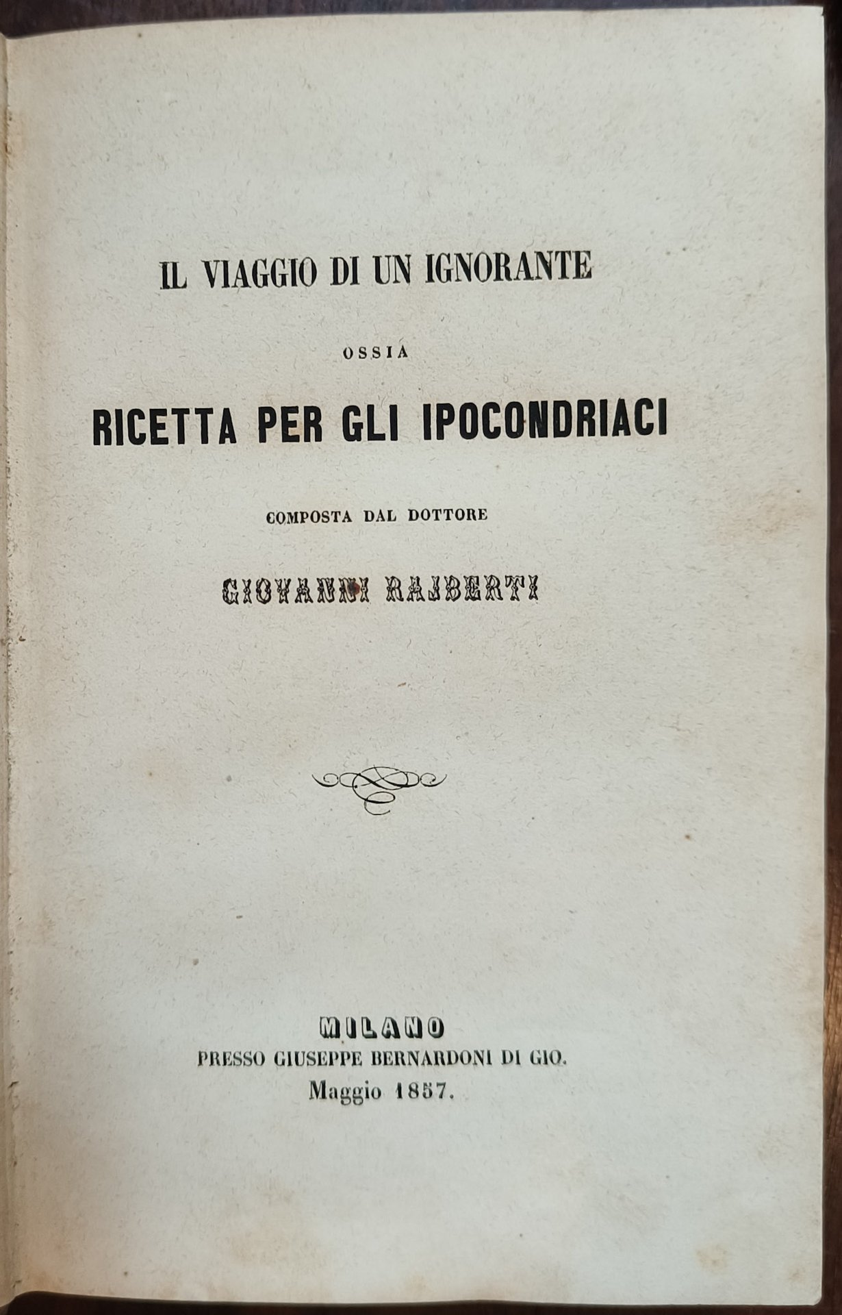 Giovanni Rajberti, Tomo 1: Il viaggio di un ignorante ossia ricetta per gli ipocondriaci, Milano, Giuseppe Bernardoni, 1857; Tomo 2: Sul gatto cenni fisiologici e morali del dottore Giovanni Raiberti coll'appendice della coda, Milano, Giuseppe Bernardoni, 1859.