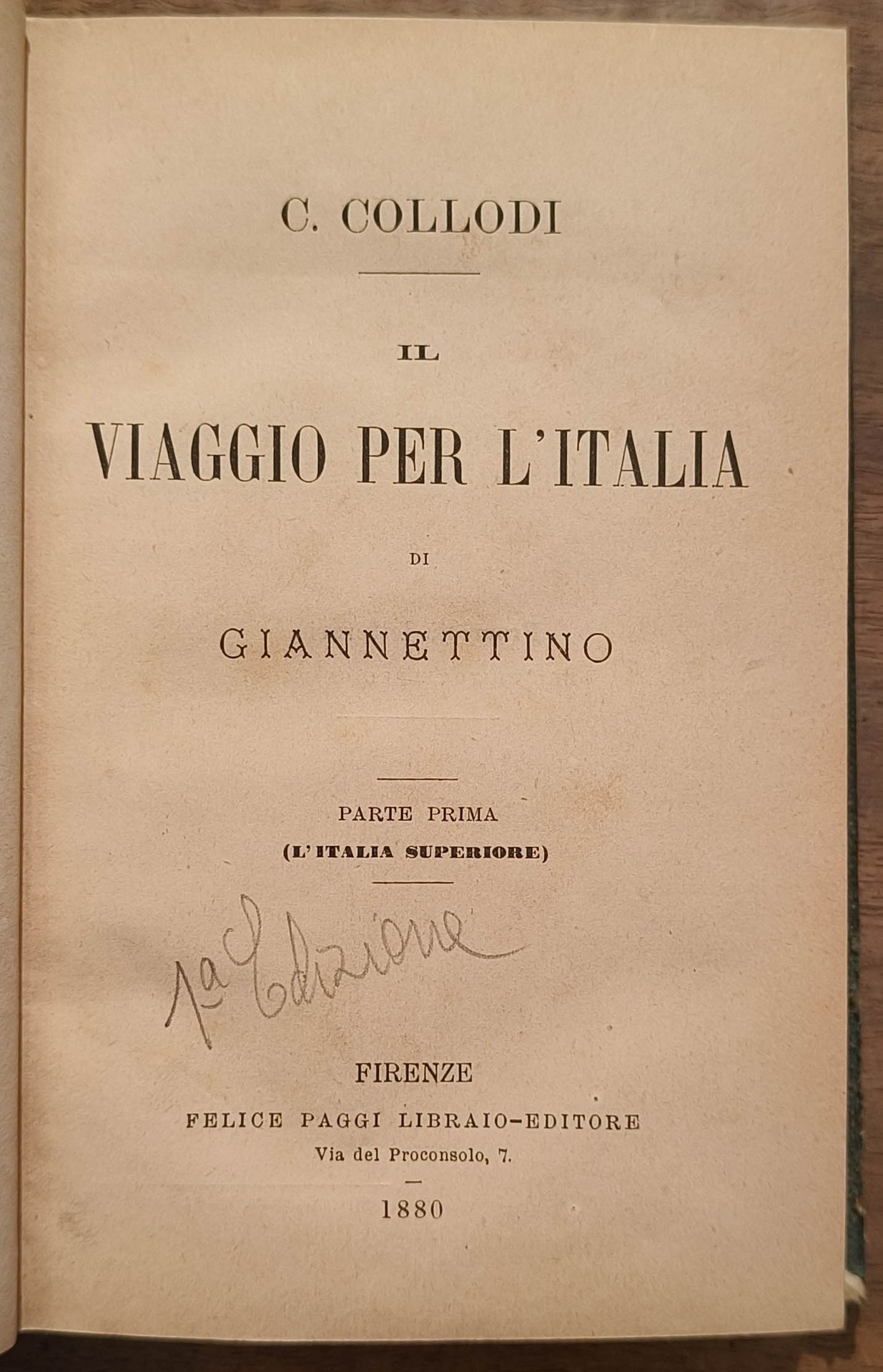 Il viaggio per l'Italia. Parte prima e parte seconda, Firenze, Felice Paggi Libraio Editore, 1880, 1883. Prima edizione. Cm 18. Pp. (6) 320 (6) 319 (1) VIII (due volumi rilegati insieme). Legatura in percallina verde, autore e titolo in oro al dorso. Lievi segni d'usura alla legatura. Numerose illustrazioni a piena pagina nel testo.