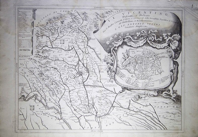 Carta geografica della provincia di Vicenza di mm. 600 x 450 circa (=lxh) pi˘ margini. Tratta da Vincenzo Maria Coronelli, Corso Geografico Universale, Venezia, 1690-95. Con aloni di vecchia umidit‡.
