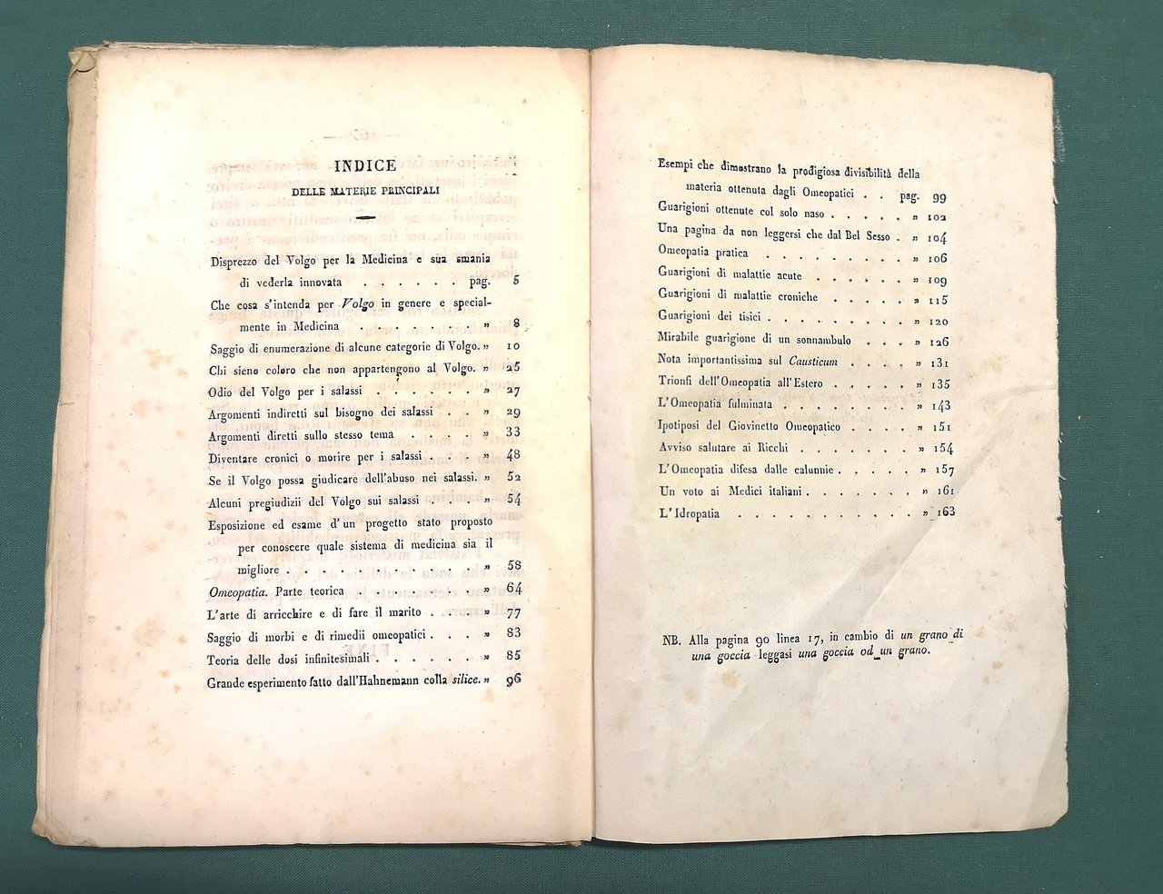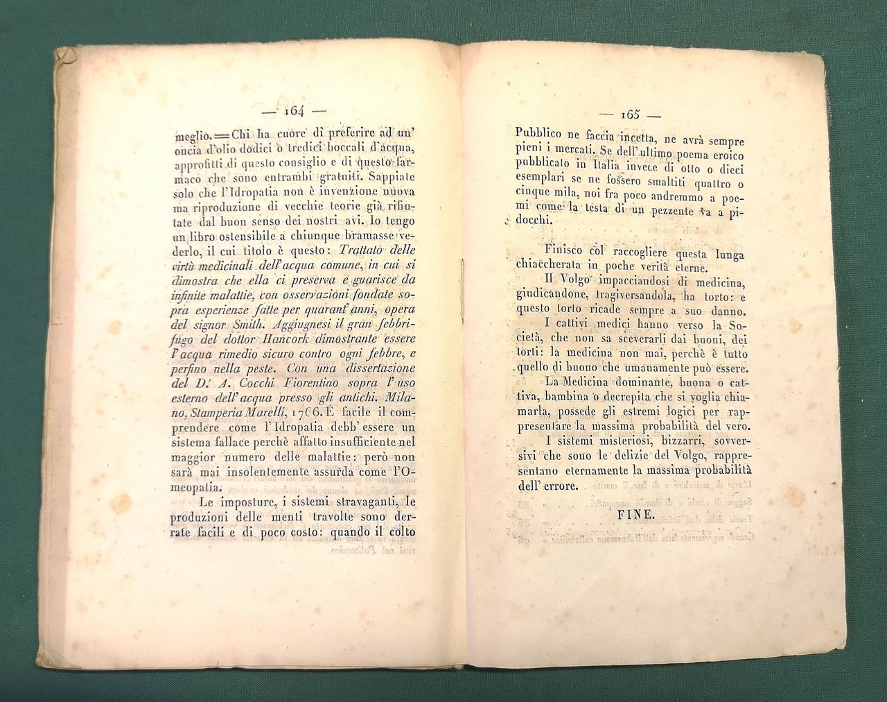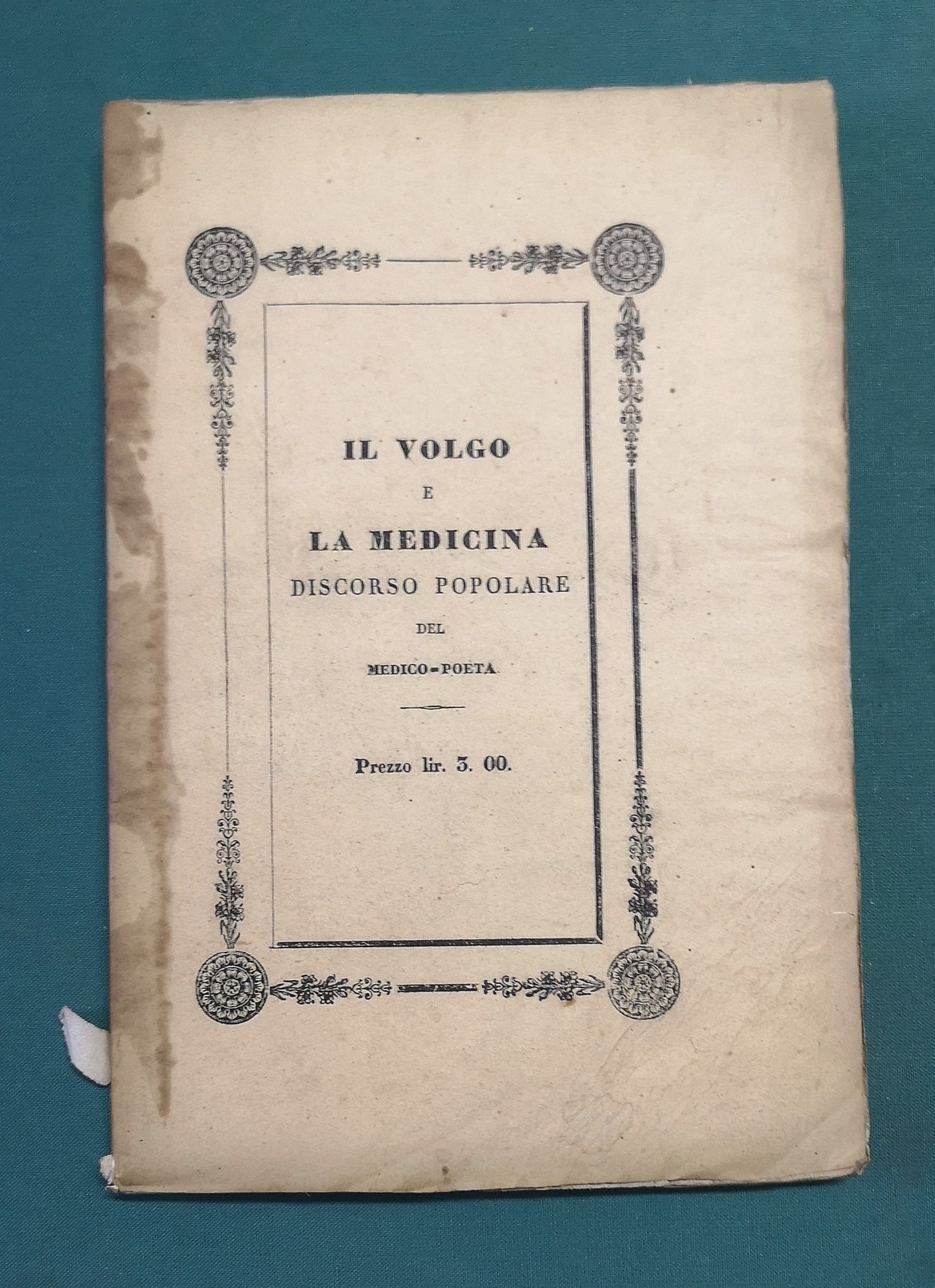>in-8, pp. 165, (3), broch. edit. con graziosa cornice tipografica (alone alla cerniera ant. e piatto post. mancante). Edizione originale. L'opera denuncia i vari pregiudizi del popolo nei confronti della medicina e critica fortemente la pratica dell'omeopatia, disciplina a cui dedica numerosi capitoli per spiegarne teoria e pratica. Buon esemplare, a pieni margini, in barbe (qualche sporadica arrossatura della carta).