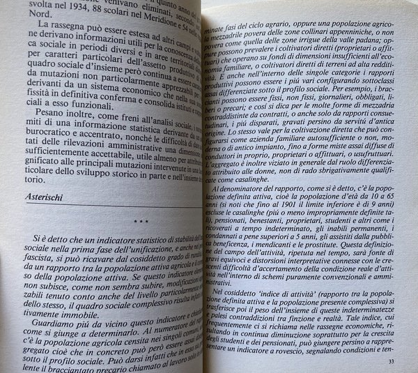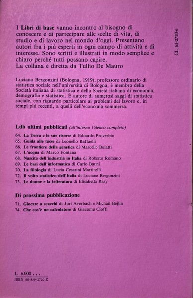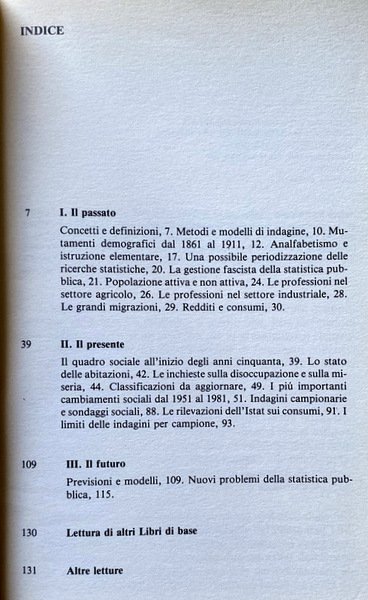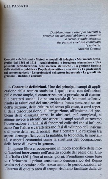 Soggetti: Scienze sociali, Sociologia, Statistica sociale, Antropologia, Studi culturali, Documenti, Dati, Popolazione, Ricerca, Ricerche sociologiche, Fine Ottocento, Novecento, Indagini sociali, Demografia, Italia, Unità, Unificazione, Anni Venti, Anni Trenta, Anni Quaranta, Anni Cinquanta, Anni Sessanta, Anni Settanta, Anni Ottanta, Dopoguerra, Tullio De Mauro, Scienze politiche, Istituzioni, Stato, Politica, Economia, Partiti politici, Statistiche, Grafici, Indici, Elenchi, Numeri, Analfabetismo, Alfabetizzazione, Scuola, Classi sociali, Borghesia, Proletariato, Forza Lavoro, Stratificazione demografico-sociale, Turismo, Rilevazioni, Problemi logici e tecnici, Paradossi, Abuso, Spopolamento, Città, Campagna, Contadini, Terziario, Artigianato, Proletariato, Operai, Fabbriche, Industria, Produzione, Importazioni, Esportazioni, Merci, Agricoltura, Famiglia, Figli, Disaggregazione socio-professionale delle famiglie, Fascismo, Mutamenti sociali, Bibliografia, Libri Vintage Fuori catalogo, Saggistica, Campione statistico, Campionamenti, Povertà, Ricchezza, Sondaggio, Interviste, Domande, ISTAT, CENSIS, Urbanizzazione, Densità, Abitanti, Fecondità, Mortalità infantile, Vita media, Censimento, Emigrazione, Immigrazione, Stranieri, Consumi, Paniere, Crisi, Annali, Disoccupazione, Disoccupati, Potere d'acquisto, Moneta, Debito, Reddito, Risparmio, Istruzione, Abbandono scolastico, Professioni, Redditi pro-capite, Bambini, Anziani, Ragazzi, Matrimonio, Romolo Maiakos, Athos Bellettini, Annali, Vitali, Vittorio Castellano, Giovanni Montemartini, Somogyi, Salvemini, Livi Bacci, Confronti, Fenomeni, Divario Nord-Sud, Social sciences, Sociology, Anthropology, Cultural studies, Documents, Data, Population, Research, Sociological research, Late nineteenth century, Twentieth century, Social surveys, Demography, Italy, Unification, Twenties, Thirties, Forties, Years Fifties, Sixties, Seventies, Eighties, Postwar period, Political sciences, Institutions, State, Politics, Economy, Political parties, Statistics, Graphs, Indices, Lists, Numbers, Illiteracy, Literacy, School, Social classes, Bourgeoisie, Proletariat, Workforce, Demographic-social stratification, Tourism, Surveys, Logical and technical problems, Paradoxes, Abuse, Depopulation, Cities, Countryside, Peasants, Tertiary sector, Handicraft, Proletariat, Workers, Factories, Industry, Production, Imports, Exports, Goods, Agriculture, Family, Children, Socio-professional breakdown of families, Fascism, Social changes, Bibliography, Out of print books, Non-fiction, Sampling, Poverty, Wealth, Survey, Interviews, Questions, Urbanization, Density, Inhabitants, Fertility, Infant mortality, Average life, Census, Emigration, Immigration, Foreigners, Consumption, Basket, Crisis, Annals, Unemployment, Unemployed, Power Purchase, Money, Debt, Income, Savings, Education, School dropout, Professions, Per capita incomes, Children, Seniors, Teens, Marriage, Annals, Comparisons, Phenomena, North-South divide