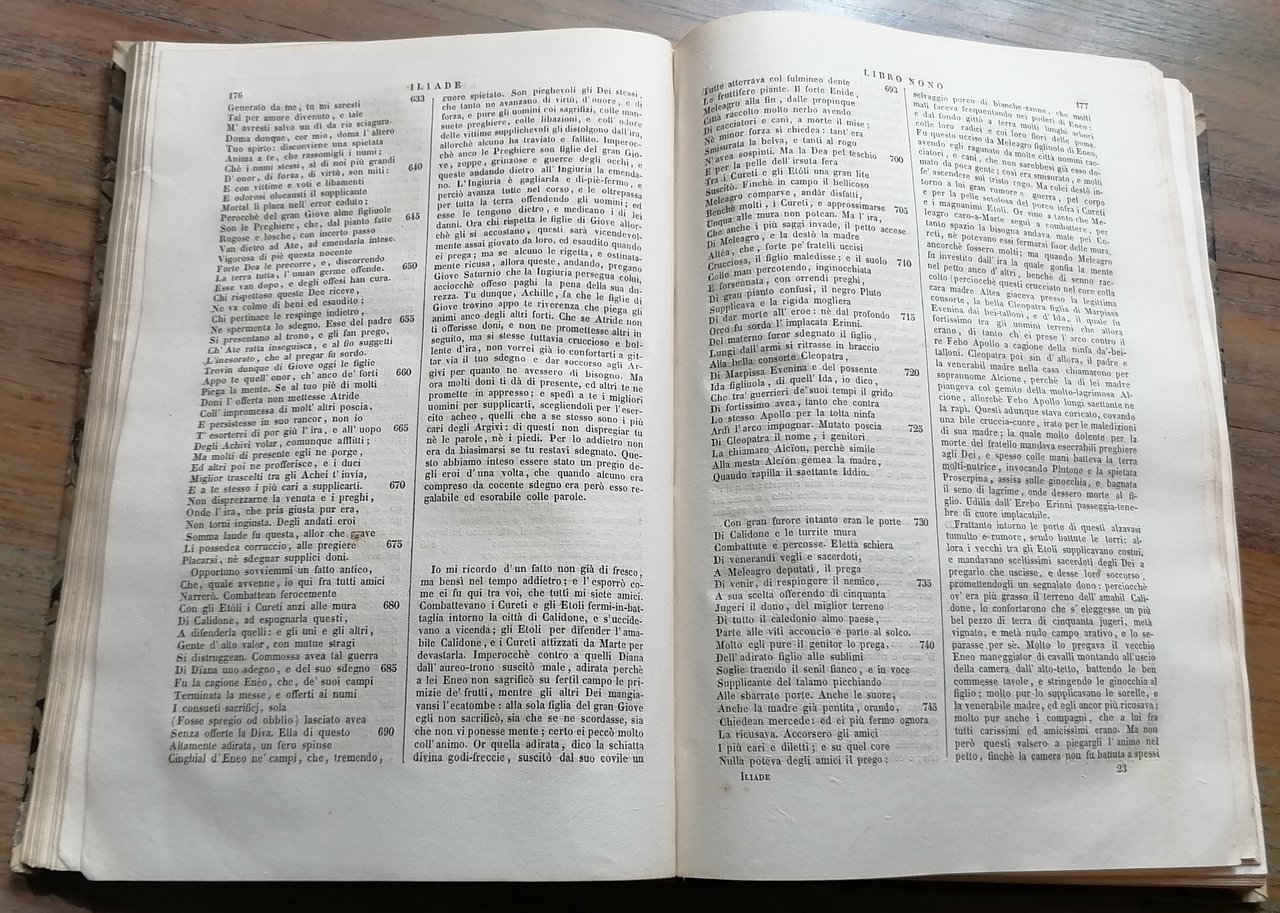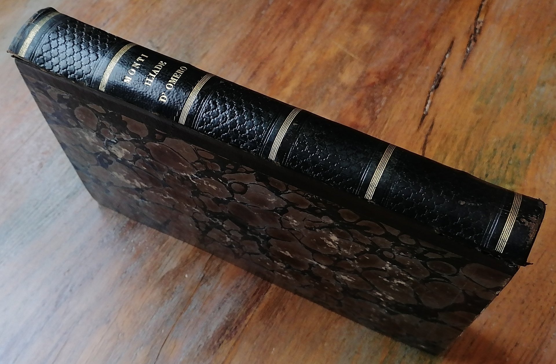 (Versioni omeriche; Iliade; Traduzione; Neoclassicismo) In 8° grande, legatura coeva in mezza pelle nera, al dorso titoli e filetti dorati, impressioni a secco, carta marmorizzata ai piatti, pp. (2),XII,498,(2). Testo su due colonne. Legatura con lieve fessurazione alla cerniera posteriore, peraltro volume in ottimo stato di conservazione, carta bianca.