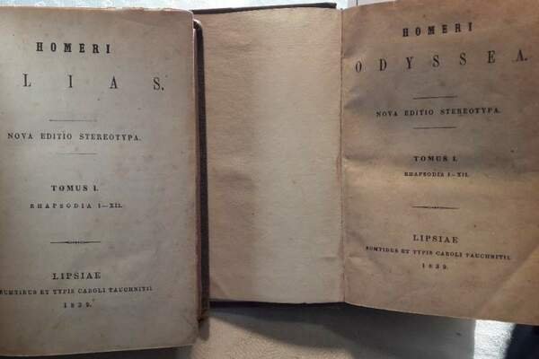 2 Voll. due tomi per ogni opera legati insieme, in 16', leg. tela con tit. in oro al dorso: Odyssea; nova editio stereotypa-tomus I Rapsodia I-XIL, pp. 252, tomus II-Rhapsodia XIII-XXIV Carmina Minora, pp. 360. Ilias; nova editio stereotypa, tomus I-Rhapsodia 1-XIL, pp. 301, tomus II- Rhapsodia XIII-XXIV, pp. 320. Fessure lungo i dorsi, ammaccature agli angoli, legature salde, interni in buono stato, bruniture e segni del tempo. ***Due to bureaucratic reasons, books dated over 70 years old cannot be immediately exported, please contact us before placing the order.***
